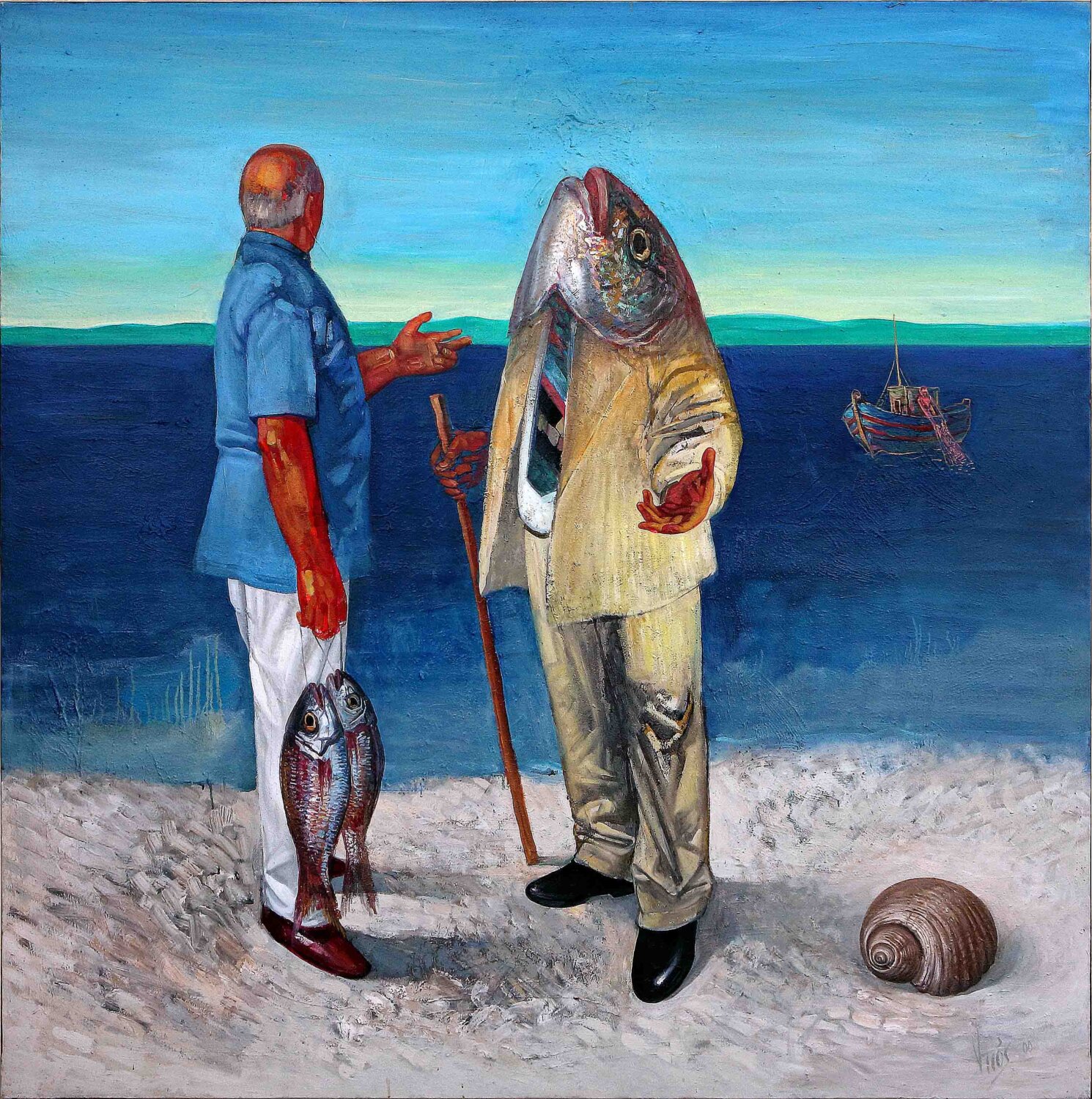 Η ζωγραφική του Κώστα Ντιού, ενός σπουδαίου πραγματικά, κατά τη γνώμη μου, δημιουργού αλλά ελάχιστα γνωστού εκτός των τειχών της εικαστικής μας Ιερουσαλήμ, εμπεριέχει με δαψίλεια όλα τα ανωτέρω στοιχεία: Δηλαδή τη βαθιά γνώση της δυτικοευρωπαϊκής τέχνης – έχει σπουδάσει στο Παρίσι – πλάι στην έντονη εξισορρόπηση του προσωπικού του ιδιώματος ανάμεσα στο συναίσθημα και τον ορθολογισμό, την εμπειρία και το ένστικτο, τον σεβασμό αλλά και ταυτόχρονα την τολμηρή αμφισβήτηση της, όποιας παράδοσης. Ιθαγενούς ή εισαγόμενης. Αλλά και πάλι όλες αυτές οι ιδιότητες θα ήταν στεγνός, επιδερμικός τύπος, αν δεν προσθέταμε στα παραπάνω την έξοχή του ικανότητα να λέει μαγικές ιστορίες με τις αινιγματικές εικόνες του, ν’ ανασταίνει το παρελθόν δίνοντας ζωή στους πεθαμένους φίλους του και να καθιστά τη γενέθλια πόλη του, την Κοζάνη, το κέντρο ενός ιδιότυπου σύμπαντος που για έναν περίεργο λόγο – προσωπικά δεν διαθέτω εύκολη απάντηση – μάς αφορά όλους.