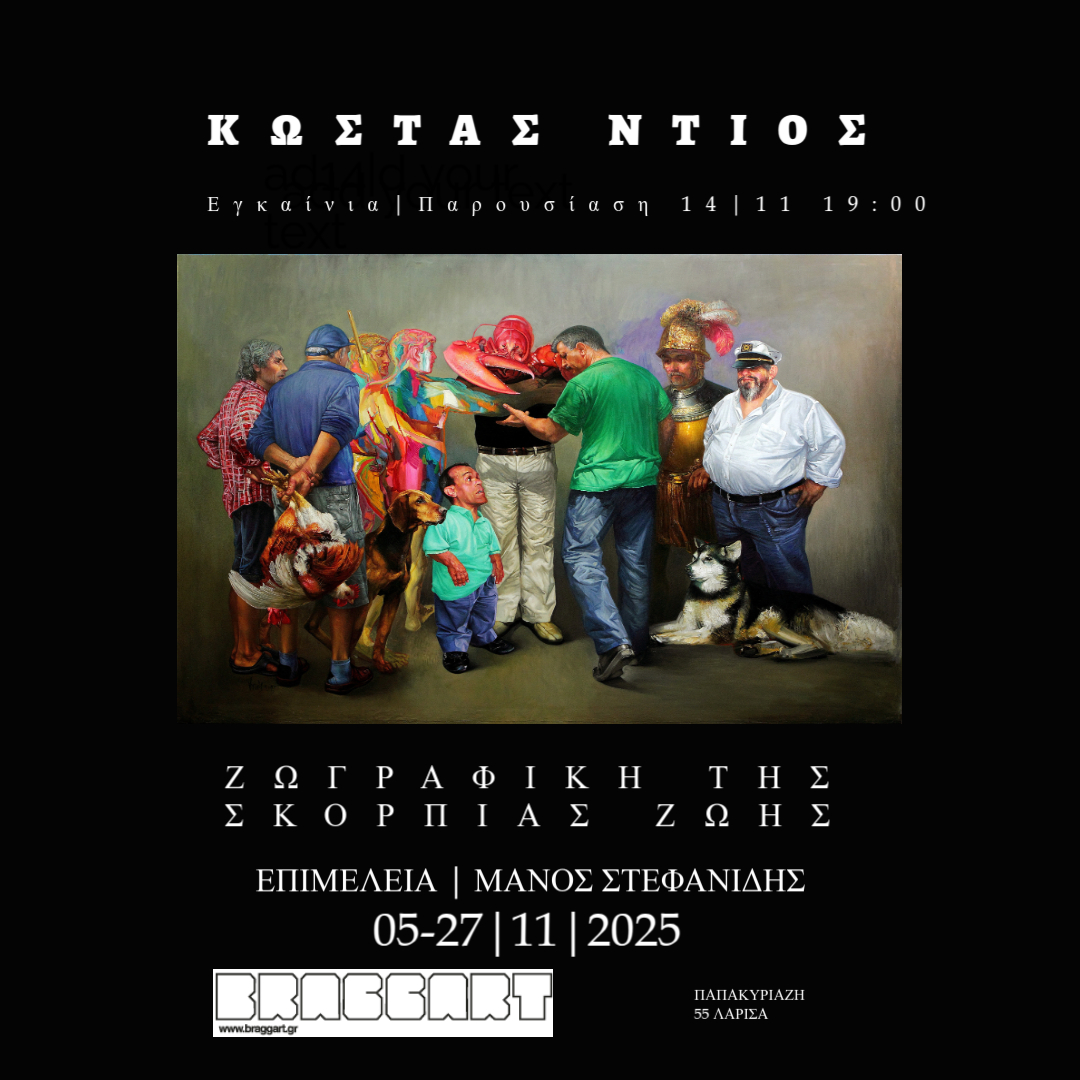 Η γκαλερί σύγχρονης τέχνης Braggart Contemporary Gallery παρουσιάζει την ατομική έκθεση του εικαστικού Κώστα Ντιού, με τίτλο «Ζωγραφική της σκόρπιας ζωής» [Από το αφήγημα του Ν.Γ.Πεντζίκη «Αρχιτεκτονική της σκόρπιας ζωής» ] από τις 05–27 Νοεμβρίου 2025, στο art box Παπακυριαζή 55 & Σκαρλάτου Σούτσου στη Λάρισα. Τα εγκαίνια-παρουσίαση από τον ιστορικό τέχνης και επιμελητή της έκθεσης Μάνο Στεφανίδη θα γίνουν Παρασκευή 14 Νοεμβρίου στις 19:00.