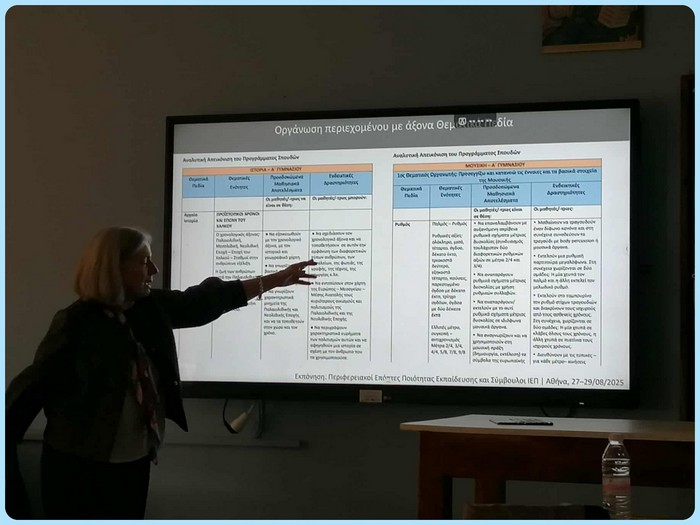 Το θέμα της Επιμόρφωσης ήταν : «Προγράμματα Σπουδών – Πολλαπλό Βιβλίο – Διαδικασίες Επιλογής». Η παρουσίαση της Συμβούλου περιείχε τα χαρακτηριστικά των Νέων Προγραμμάτων Σπουδών: Αναγκαιότητα και Προοπτικές, τη Φιλοσοφία του Πολλαπλού Βιβλίου: Μια Νέα Παιδαγωγική Προσέγγιση και τα Κριτήρια & διαδικασίες επιλογής βιβλίου.