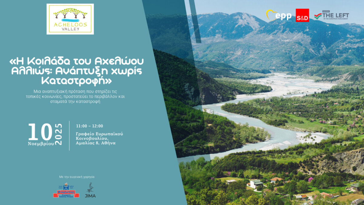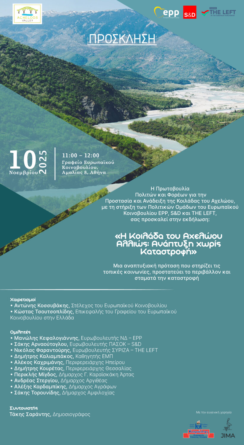 Μια νέα προοπτική για την ανάπτυξη της Κοιλάδας του Αχελώου αναδεικνύεται τη Δευτέρα 10 Νοεμβρίου 2025, στις 11:00, στο Γραφείο του Ευρωπαϊκού Κοινοβουλίου στην Ελλάδα (Λεωφ. Αμαλίας 8, Σύνταγμα), μέσα από την εκδήλωση με τίτλο: «Η Κοιλάδα του Αχελώου Αλλιώς: Ανάπτυξη χωρίς καταστροφή.»