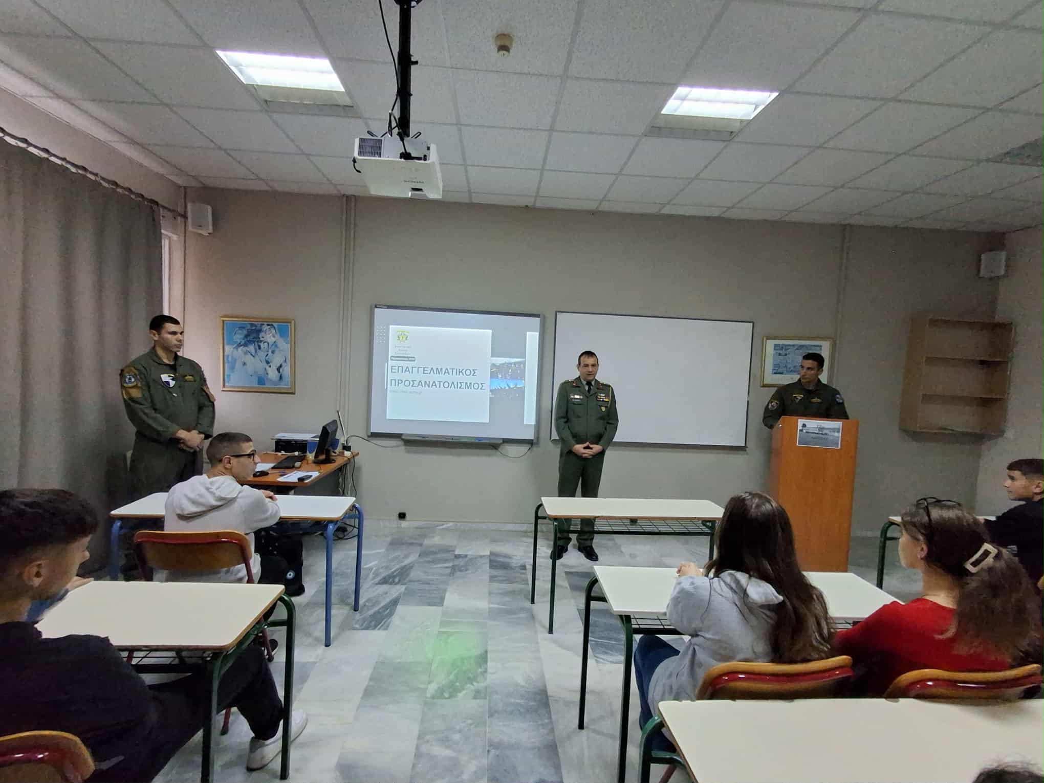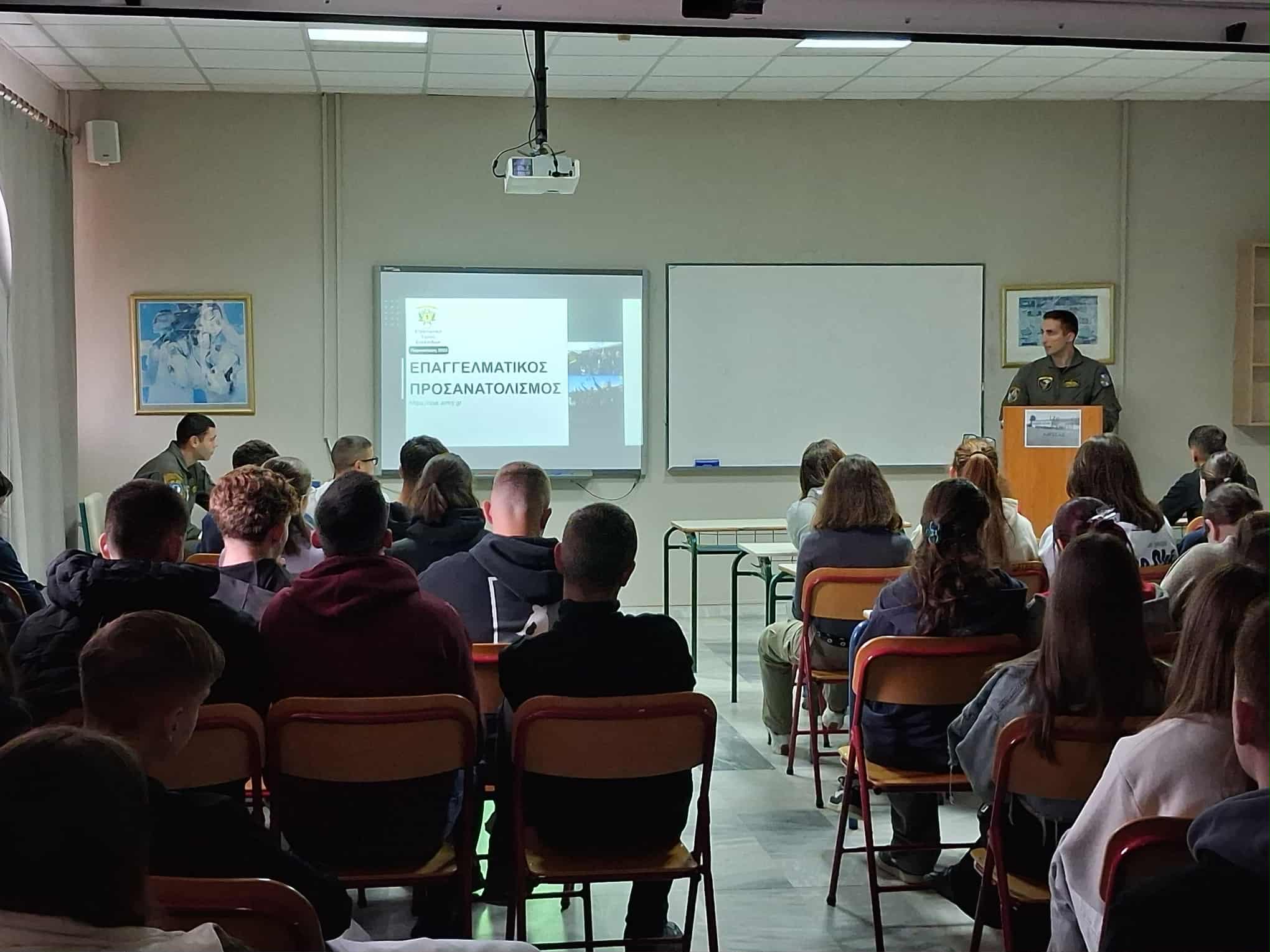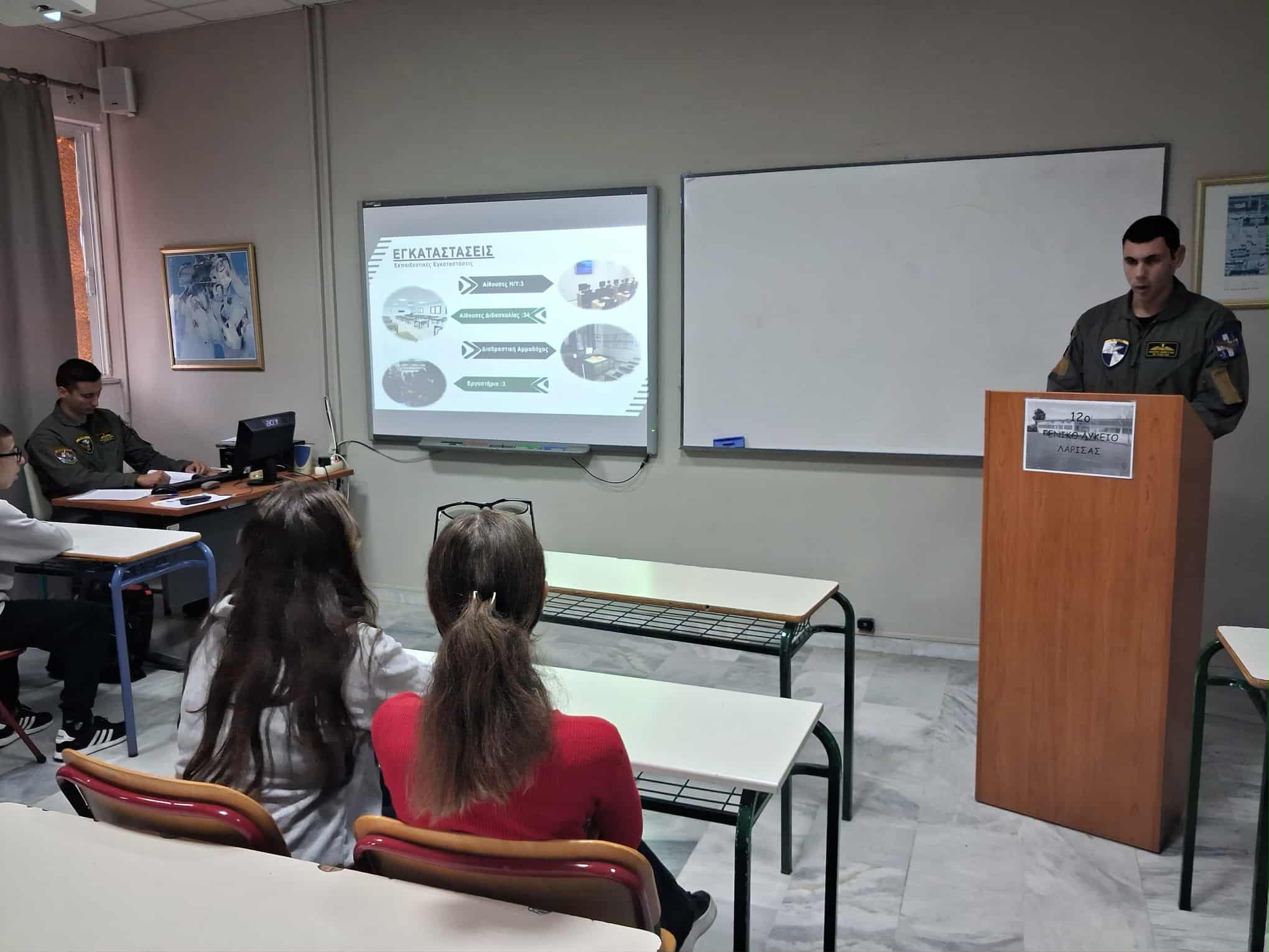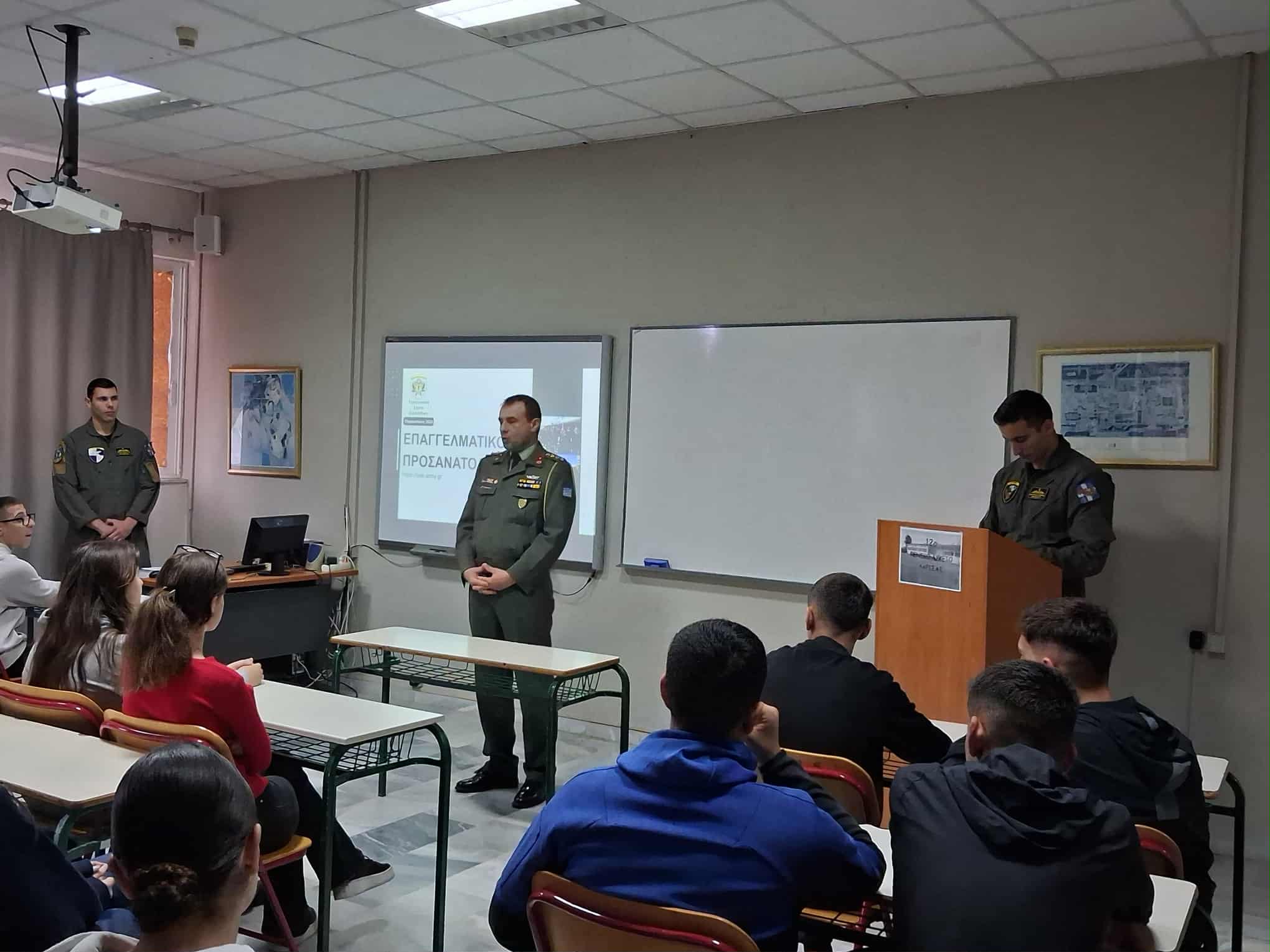 Την Τετάρτη 5 Νοεμβρίου η Β΄ τάξη του12ο ΓΕΛ Λάρισας στο πλαίσιο του επαγγελματικού προσανατολισμού, ενημερώθηκε από εκπροσώπους της 1ης Στρατιάς και της 1ης ΤΑΞΑΣ για τις προοπτικές που δημιουργούνται με την είσοδό τους στις Στρατιωτικές Σχολές Τριτοβάθμιας Εκπαίδευσης (Στρατιωτική Σχολή Ευελπίδων, Σχολή Μονίμων Υπαξιωματικών) και τη σταδιοδρομία τους ως Στελέχη του Στρατού Ξηράς.