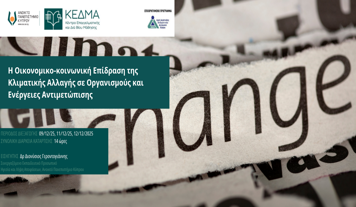 Το Κέντρο Επαγγελματικής και Διά Βίου Μάθησης (ΚΕΔΜΑ) του Ανοικτού Πανεπιστημίου Κύπρου (ΑΠΚΥ) διοργανώνει διαδικτυακό πρόγραμμα / σεμινάριο επιμόρφωσης με τίτλο Η «Οικονομικο-κοινωνική Επίδραση της Κλιματικής Αλλαγής σε Οργανισμούς και Ενέργειες Αντιμετώπισης».Το Πρόγραμμα επιχορηγείται από την Αρχή Ανάπτυξης Ανθρώπινου Δυναμικού (ΑνΑΔ) της Κυπριακής Δημοκρατίας.