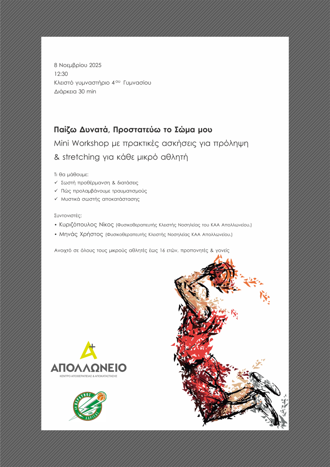Το Σάββατο 8 Νοεμβρίου 2025, στις 12:30, στο Κλειστό Γυμναστήριο του 4ου Γυμνασίου, θα πραγματοποιηθεί το mini workshop «Παίζω Δυνατά, Προστατεύω το Σώμα μου», μια σύντομη αλλά ουσιαστική δράση διάρκειας 30 λεπτών που απευθύνεται σε μικρούς αθλητές έως 16 ετών, προπονητές και γονείς.