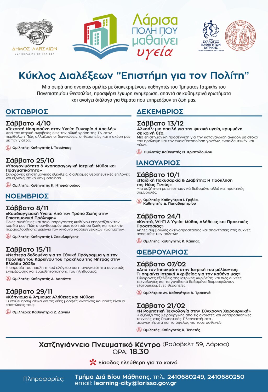 Ο Σύλλογος Καθηγητών του Τμήματος Ιατρικής του Πανεπιστημίου Θεσσαλίας, σε συνεργασία με την Αντιδημαρχία Παιδείας και Άθλησης του Δήμου Λαρισαίων, συνεχίζουν τον επιτυχημένο κύκλο ανοιχτών ομιλιών για την υγεία «Επιστήμη για τον Πολίτη – Ανοιχτές Ομιλίες Υγείας», στο πλαίσιο της δράσης «Λάρισα – Πόλη που Μαθαίνει» και του Πανεπιστημίου των Πολιτών.