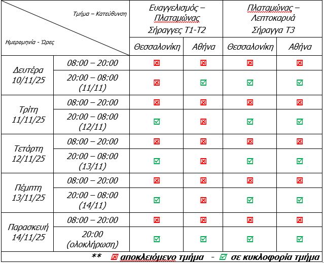 - Τετάρτη 12 Νοεμβρίου 2025 απόγευμα: απόδοση σε κυκλοφορία τμήματος Ευαγγελισμός – Λεπτοκαρυά προς Θεσσαλονίκη και Λεπτοκαρυά – Πλαταμώνας προς Αθήνα (θα παραμείνει αποκλεισμένο το τμήμα Πλαταμώνας – Ευαγγελισμός προς Αθήνα).