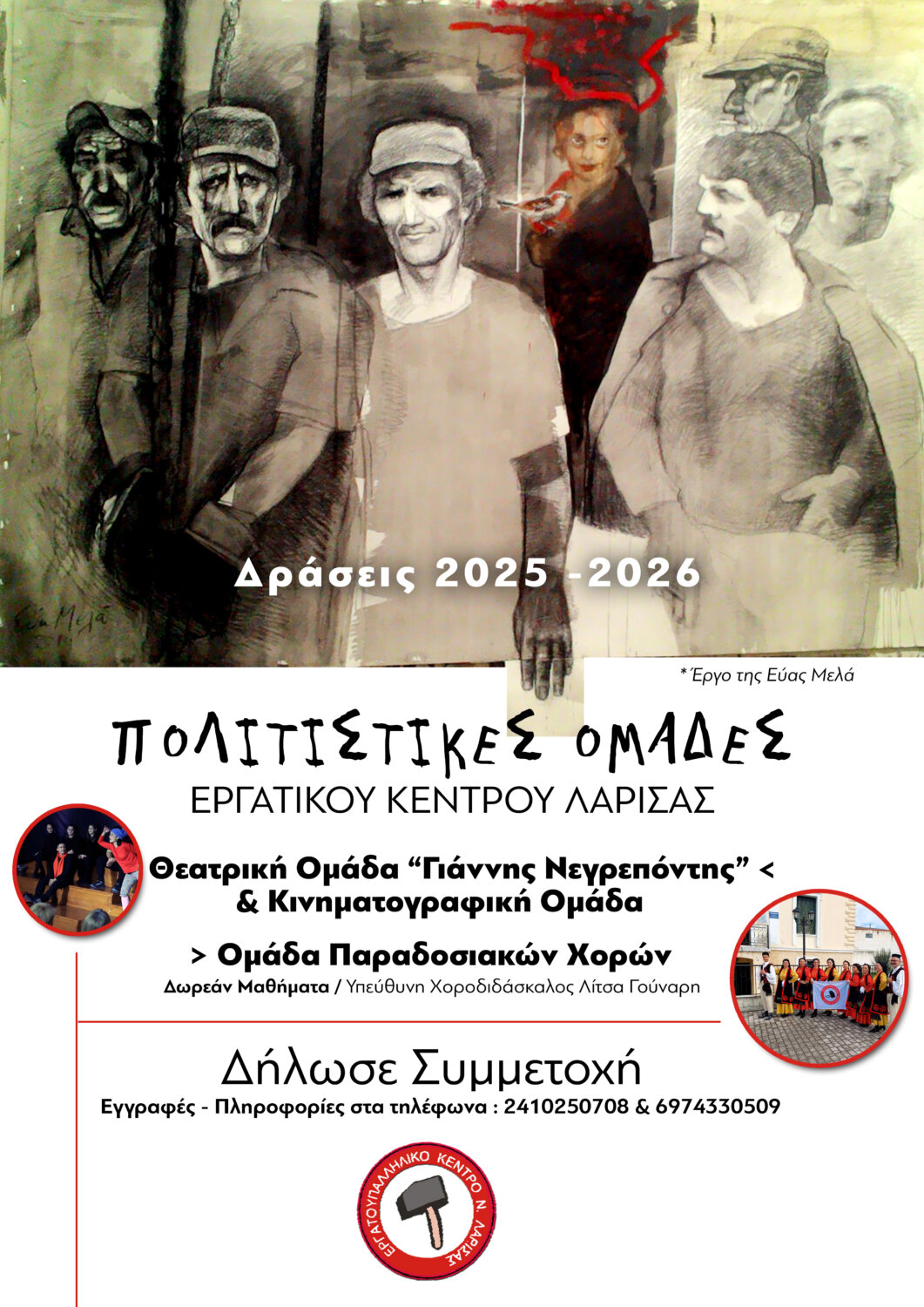 Το Εργατικό Κέντρο Λάρισας «ως μέρος του ταξικό συνδικαλιστικό κίνημα, του ΠΑΜΕ βλέπει την Τέχνη και τον Πολιτισμό ως λαϊκό δικαίωμα και την πάλη για τη διεκδίκησή τους ως μέρος της ταξικής πάλης, του αγώνα των εργατών και του εργαζόμενου λαού όχι μόνο κόντρα στα σκουπίδια της πολιτιστικής βιομηχανίας αλλά και ως μέσο εμψύχωσης, διαπαιδαγώγησης, καλλιτεχνικής έκφρασης. Εργαλείο για το δυνάμωμα της ταξικής πάλης.