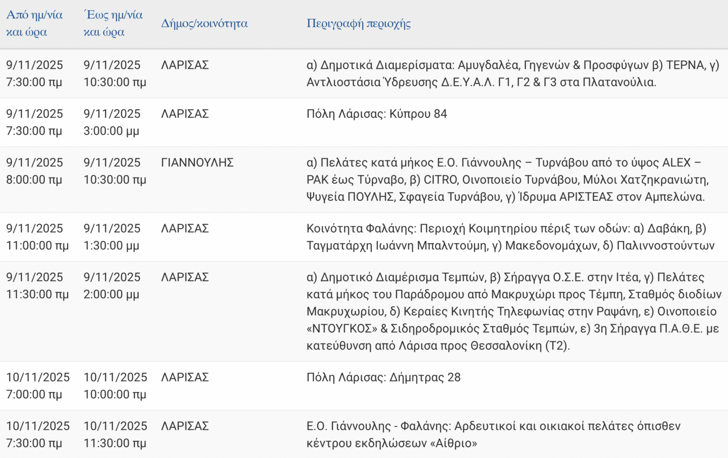 Σε προγραμματισμένες διακοπές στην παροχή ηλεκτρικού ρεύματος σε δρόμους της Λάρισας και περιοχές της Περιφερειακής Ενότητας θα προχωρήσει αύριο Κυριακή 9 και τη Δευτέρα 10 Νοεμβρίου 2025 ο ΔΕΔΔΗΕ Α.Ε.