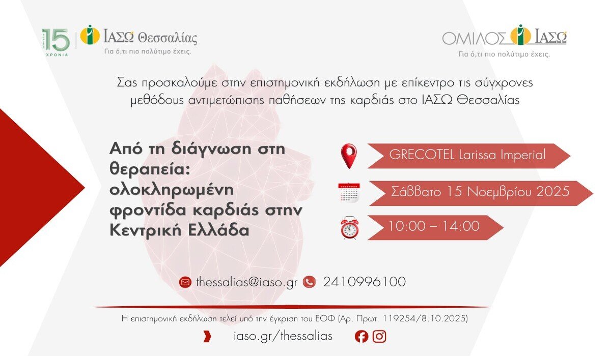 Το ΙΑΣΩ Θεσσαλίας διοργανώνει επιστημονική εκδήλωση με θέμα «Από τη διάγνωση στη θεραπεία: ολοκληρωμένη φροντίδα καρδιάς στην Κεντρική Ελλάδα», το Σάββατο 15 Νοεμβρίου 2025, στις 10:00π.μ. στο ξενοδοχείο GRECOTEL Larissa Imperial.