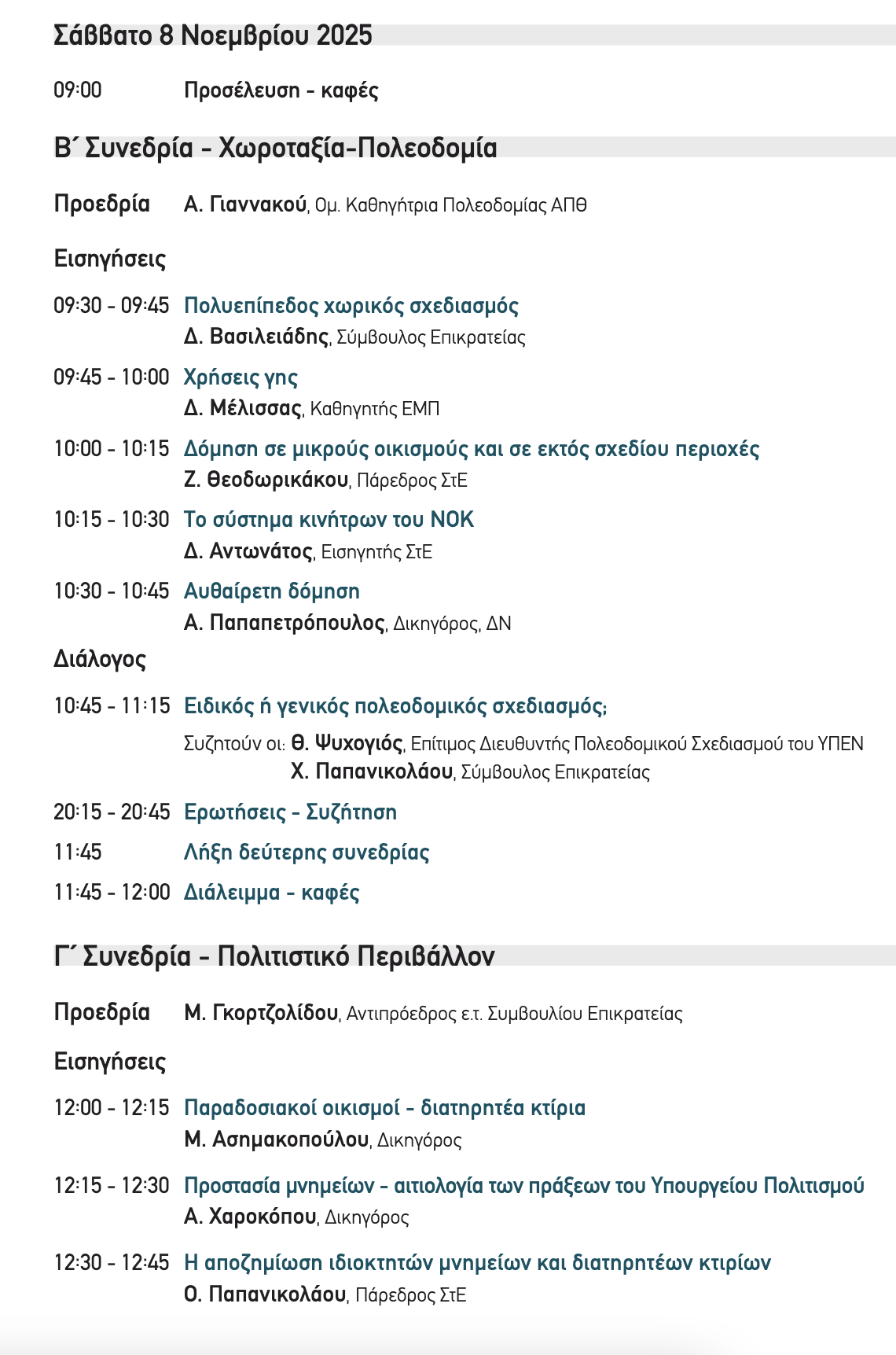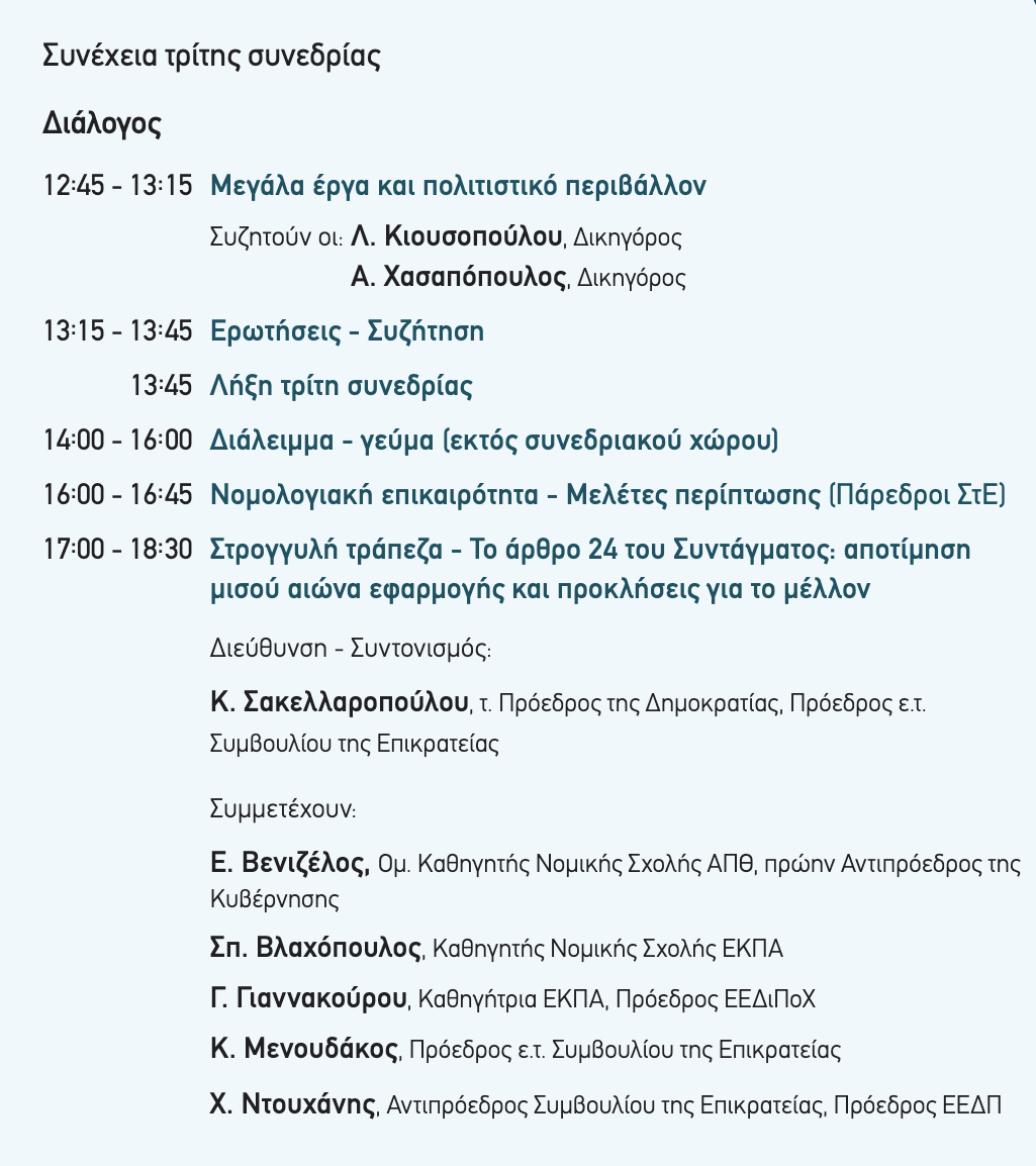Την εκδήλωση διοργανώνουν η Ελληνική Εταιρεία Δικαίου του Περιβάλλοντος (ΕΕΔΠ) και η Επιστημονική Εταιρεία Δικαίου Πολεοδομίας και Χωροταξίας (ΕΕΔΙΠΟΧ) και πραγματοποιείται υπό την αιγίδα της ΔΕΥΑΛ, του Δήμου Λαρισαίων και των εκδόσεων “Νομική Βιβλιοθήκη.
