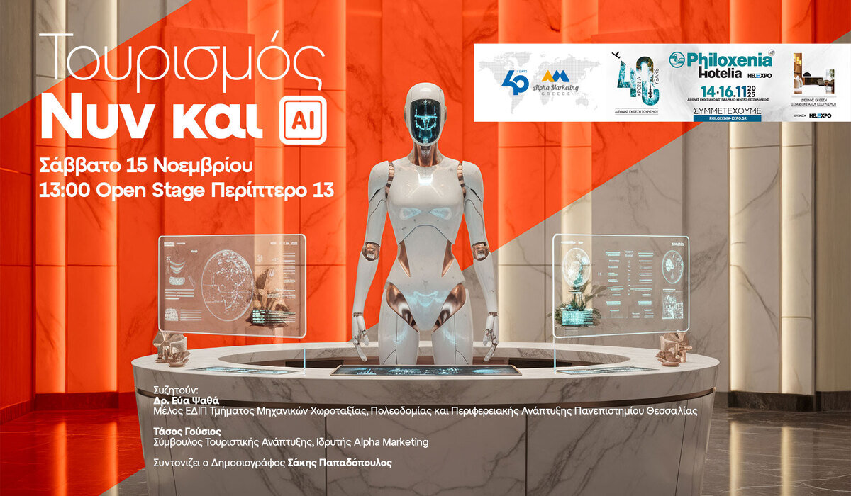 Η Alpha Marketing στο πλαίσιο της συμμετοχής της στη Philoxenia – Hotelia 2025 διοργανώνει το Σάββατο 15 Νοεμβρίου στις 13:00 στο Open Stage του Περιπτέρου 13 εκδήλωση με θέμα «ΤΟΥΡΙΣΜΟΣ ΝΥΝ ΚΑΙ ΑΙ».