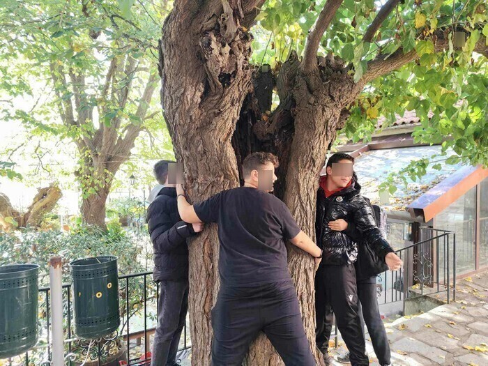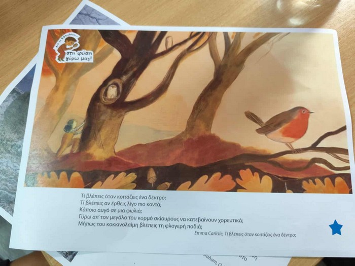 Σε δεύτερη φάση η δράση συνεχίστηκε εκτός Βιβλιοθήκης αξιοποιώντας τη φύση ως πηγή έμπνευσης. Μαζί με τους μαθητές/-ριές μας περιδιαβήκαμε τα καλντερίμια του χωριού παρατηρώντας τη φύση γύρω μας, εκείνη την ανέλπιστα ηλιόλουστη μέρα του Νοέμβρη. Ήπιαμε νερό από πέτρινες βρύσες ακούγοντας το κελάρυσμά του, απολαύσαμε τη θέα ως πέρα τη θάλασσα του Αιγαίου, μυρίσαμε ρίγανη και φασκόμηλο, γευτήκαμε κρινόροδα, ακούσαμε τα πεσμένα κίτρινα φύλλα να τριζοκοπούν κάτω από τα πόδια μας και αγκαλιάσαμε στην πλατεία, τη μουριά, για να υπολογίσουμε την ηλικία της και να νιώσουμε την αίσθηση του ξύλου στο δέρμα μας.