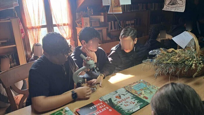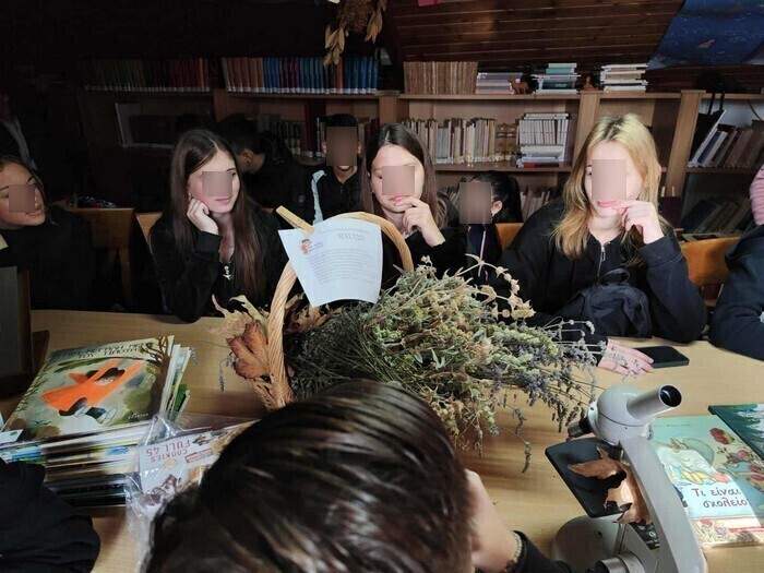 Αφού προηγήθηκε σύντομη παρουσίαση του χώρου της Βιβλιοθήκης, οι μαθητές/-τριες πήραν μέρος σε εκπαιδευτικό πρόγραμμα με τίτλο » Από τη βιβλιοθήκη στη φύση γύρω μας». Χωρισμένοι/ες σε ομάδες, αρχικά, διάβασαν μικρά λογοτεχνικά κείμενα από την ελληνική και την παγκόσμια λογοτεχνία. Ο στόχος ήταν να ανακαλύψουν τις αισθήσεις που ξυπνούν αυτά τα κείμενα, εντοπίζοντας λέξεις και φράσεις που έχουν ήχο, αναδύουν αρώματα, δημιουργούν εικόνες, θυμίζουν γεύσεις αγαπημένες και δημιουργούν μια συνεχή και ευχάριστη εμπειρία ανάγνωσης.