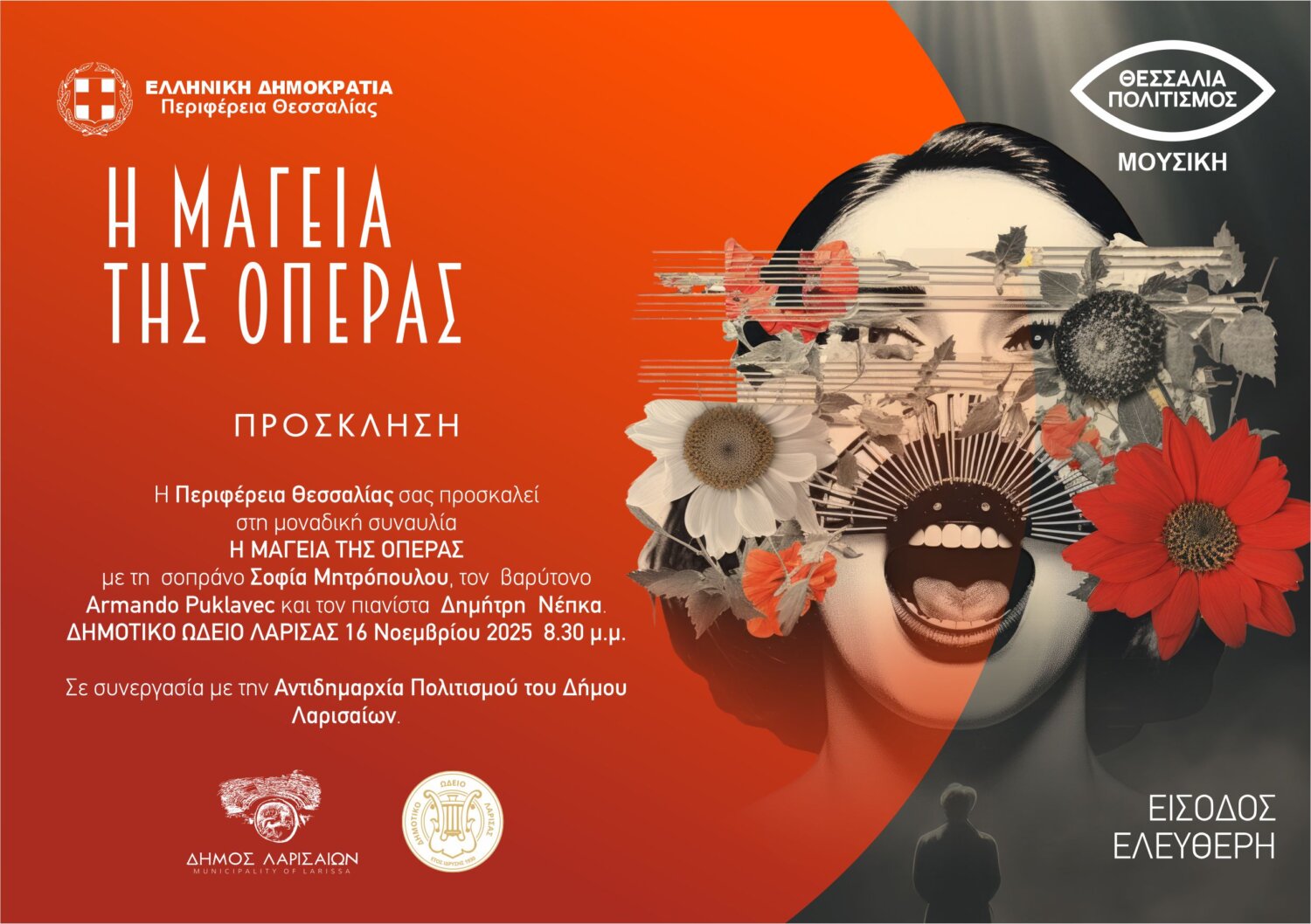 Η συναυλία με τίτλο “Η μαγεία της όπερας” θα πραγματοποιηθεί στο Δημοτικό Ωδείο Λάρισας από την Περιφέρεια Θεσσαλίας σε συνεργασία με τον δήμο Λαρισαίων, στις 16 Νοεμβρίου και ώρα 8.30 μ.μ.