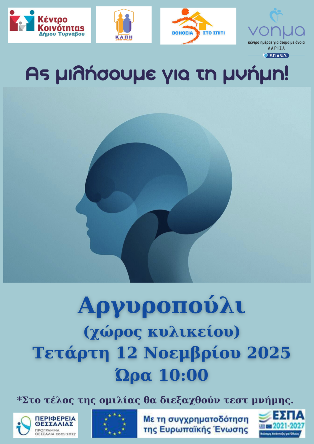 Το Κέντρο Κοινότητας, το Βοήθεια στο Σπίτι και το ΚΑΠΗ του Δήμου Τυρνάβου σε συνεργασία με το Κέντρο Ημέρας Άνοιας Λάρισας «Νόημα», εστιάζοντας στις ανάγκες της τρίτης ηλικίας, διοργανώνουν ενημερωτική εκδήλωση στο Αργυροπούλι με στόχο την ενημέρωση, καθοδήγηση και υποστήριξη των ενδιαφερομένων σε ζητήματα που τους απασχολούν.
