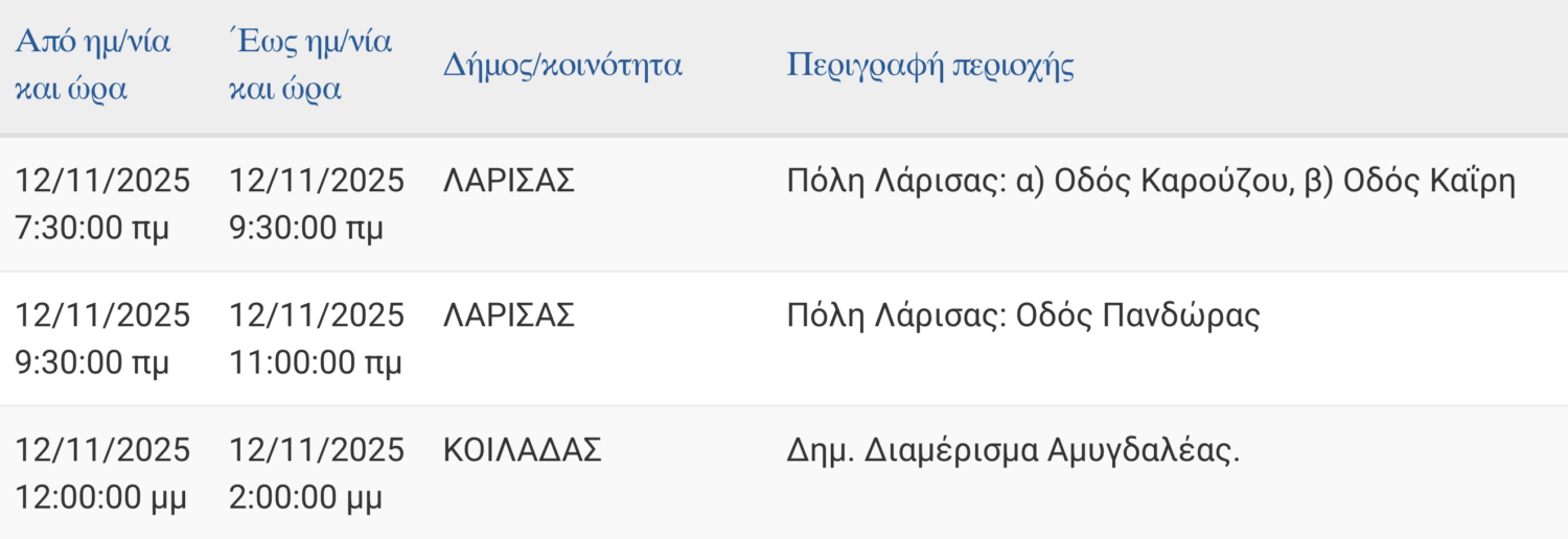 Σε προγραμματισμένες διακοπές στην παροχή ηλεκτρικού ρεύματος σε περιοχές της Λάρισας θα προχωρήσει σήμερα Τετάρτη 12 Νοεμβρίου 2025 ο ΔΕΔΔΗΕ Α.Ε.