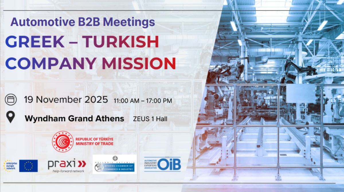 Ο Σύνδεσμος Εξαγωγέων Αυτοκινητοβιομηχανίας Uludağ διοργανώνει διμερείς επιχειρηματικές συναντήσεις (B2B) που θα πραγματοποιηθούν στο ξενοδοχείο Grand Wyndham Athens την Τετάρτη 19 Νοεμβρίου 2025, στο πλαίσιο ελληνοτουρκικής επιχειρηματικής αποστολής στον αυτοκινητοβιομηχανικό τομέα.