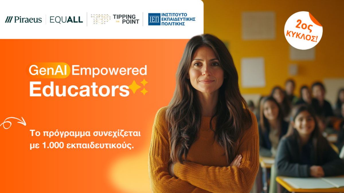 Η Πειραιώς, στο πλαίσιο του προγράμματος Εταιρικής της Υπευθυνότητας «EQUALL – Για μια Κοινωνία Ισότιμων Ανθρώπων» και τον πυλώνα της Νέας Γενιάς, υποστηρίζει για δεύτερη συνεχή χρονιά, το καινοτόμο διαδραστικό πρόγραμμα επιμόρφωσης εκπαιδευτικών «GenAI Empowered Educators» που υλοποιείται από τον οργανισμό The Tipping Point σε συνεργασία με το Ινστιτούτο Εκπαιδευτικής Πολιτικής (ΙΕΠ).