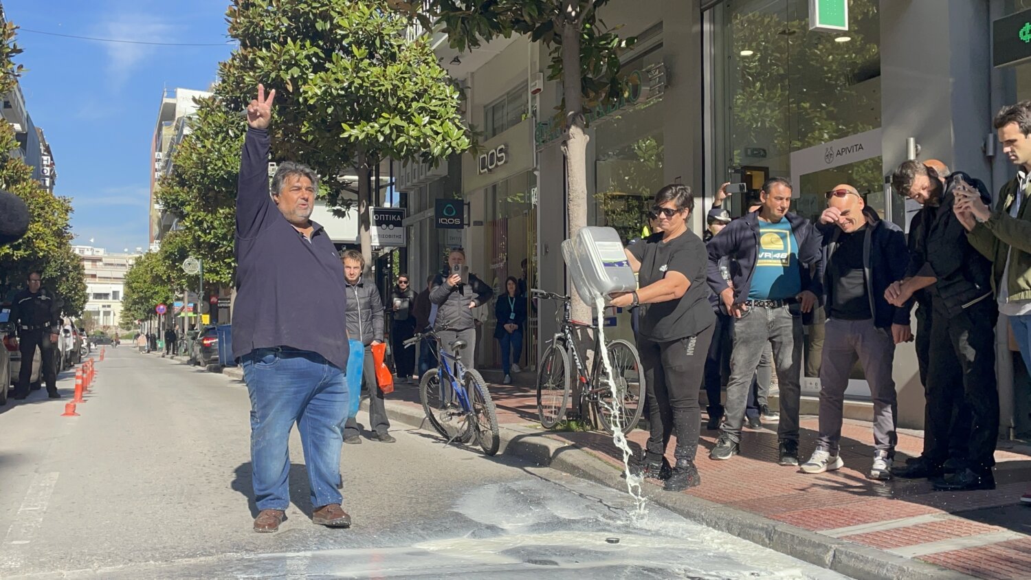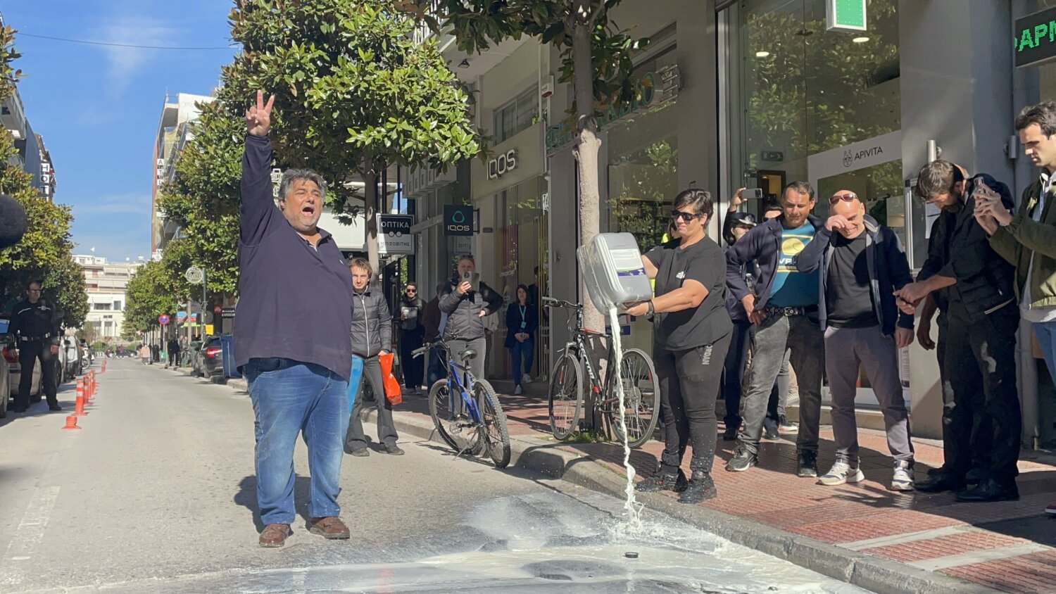 Η διαμαρτυρία συνεχίζεται έως κι αυτή την ώρα, ενώ συμβολικά οι κτηνοτρόφοι έριξαν γάλα κάτω από τα γράφει του γραφείου επί της οδού Παναγούλη.
