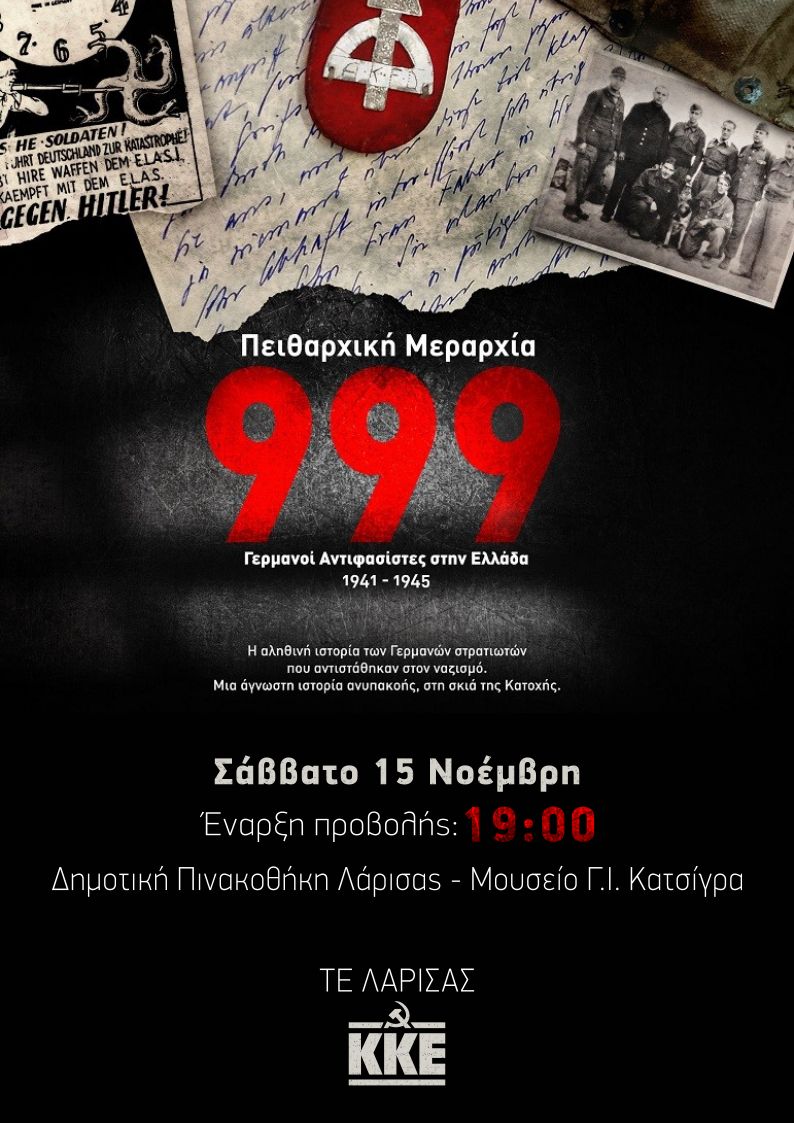 Η Τομεακή Επιτροπή Λάρισας του ΚΚΕ προβάλλει την ταινία «Η Πειθαρχική Μεραρχία «999 «», σε σκηνοθεσία Κώστα Σταματόπουλου, το Σάββατο 15 Νοεμβρίου, στις 7 μ.μ., στο αμφιθέατρο της Δημοτικής Πινακοθήκης Λάρισας.