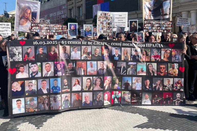 Η σημερινή πορεία στα Σκόπια ξεκίνησε από την κεντρική πλατεία και, περνώντας μπροστά από το Κοινοβούλιο, κατέληξε στο Δικαστικό Μέγαρο. Επικεφαλής βρίσκονταν οι συγγενείς των θυμάτων, κρατώντας ένα μεγάλο πανό με τα πρόσωπα των 63 νεκρών. Στην κορυφή του πανό αναγραφόταν: «63 σκιές θα σας ακολουθούν — κάθε βλέμμα ζητά δικαιοσύνη».