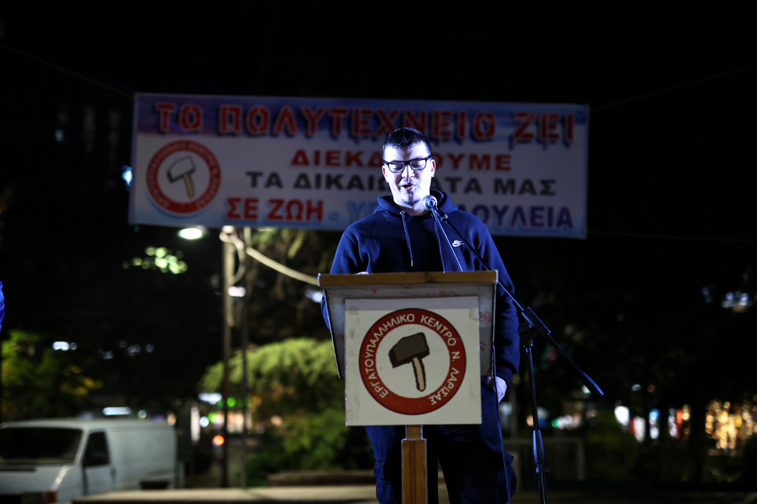 Ο πρόεδρος του Εργατικού Κέντρου, Γιάννης Σκόκας, έδωσε το στίγμα, τονίζοντας ότι τα συνθήματα του Πολυτεχνείου δυστυχώς παραμένουν επίκαιρα σήμερα και «52 χρόνια μετά οφείλουμε να συνεχίσουμε τον αγώνα ενάντια στον ιμπεριαλιστικό πόλεμο και απέναντι στην πολιτική που σπέρνει πολέμους και φτώχεια».
