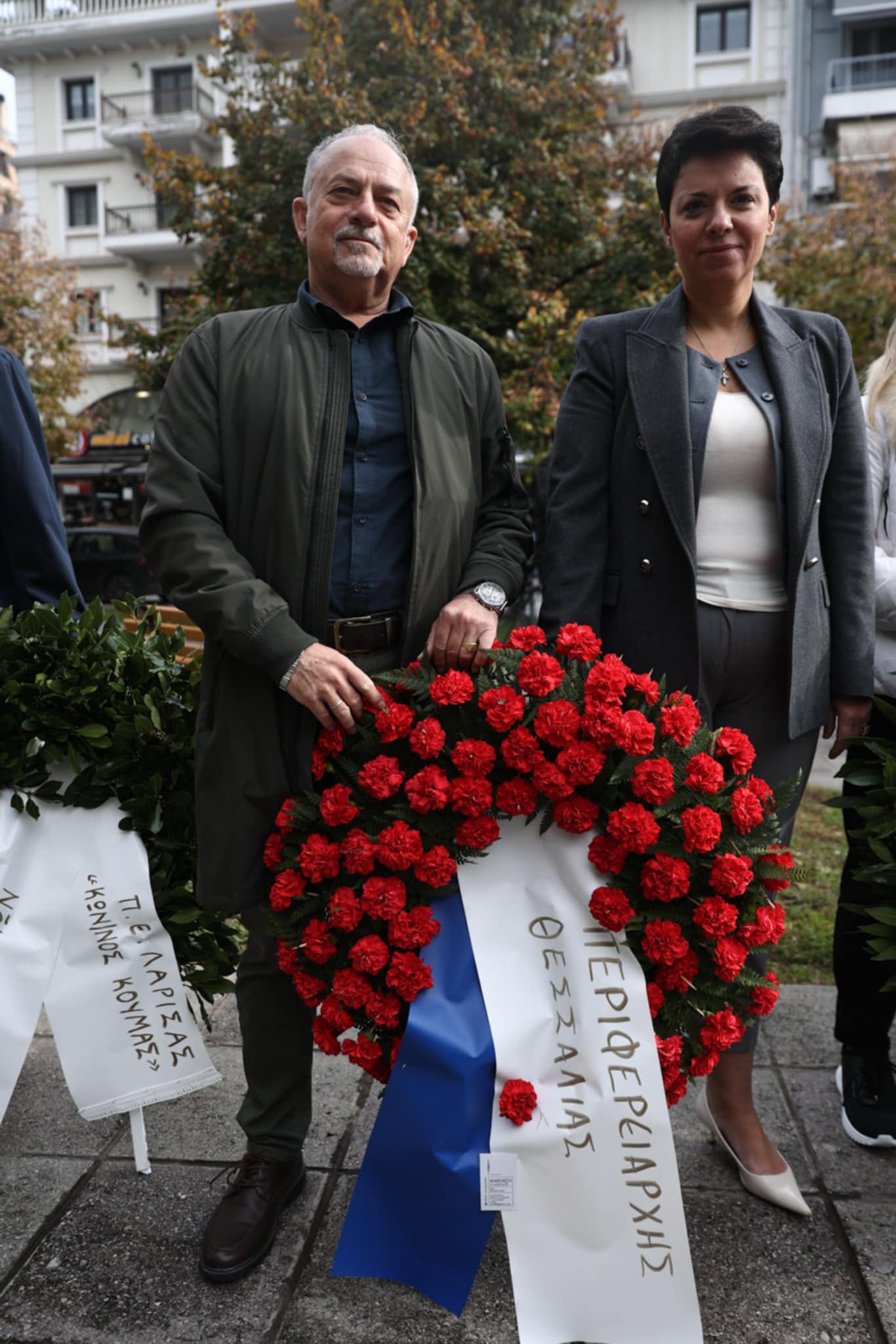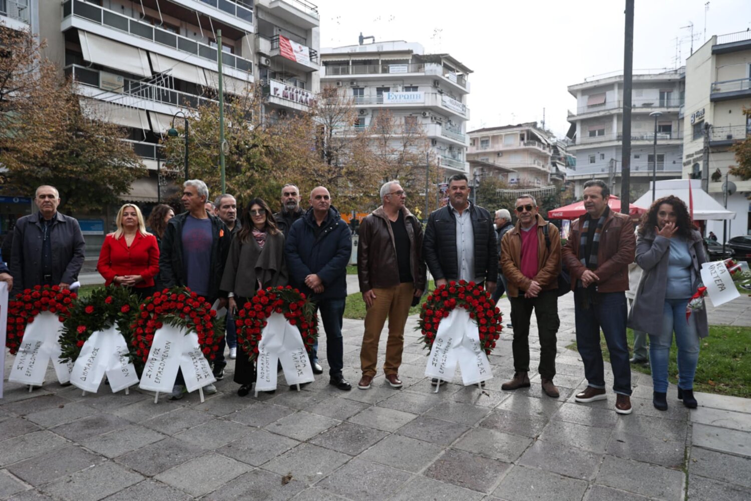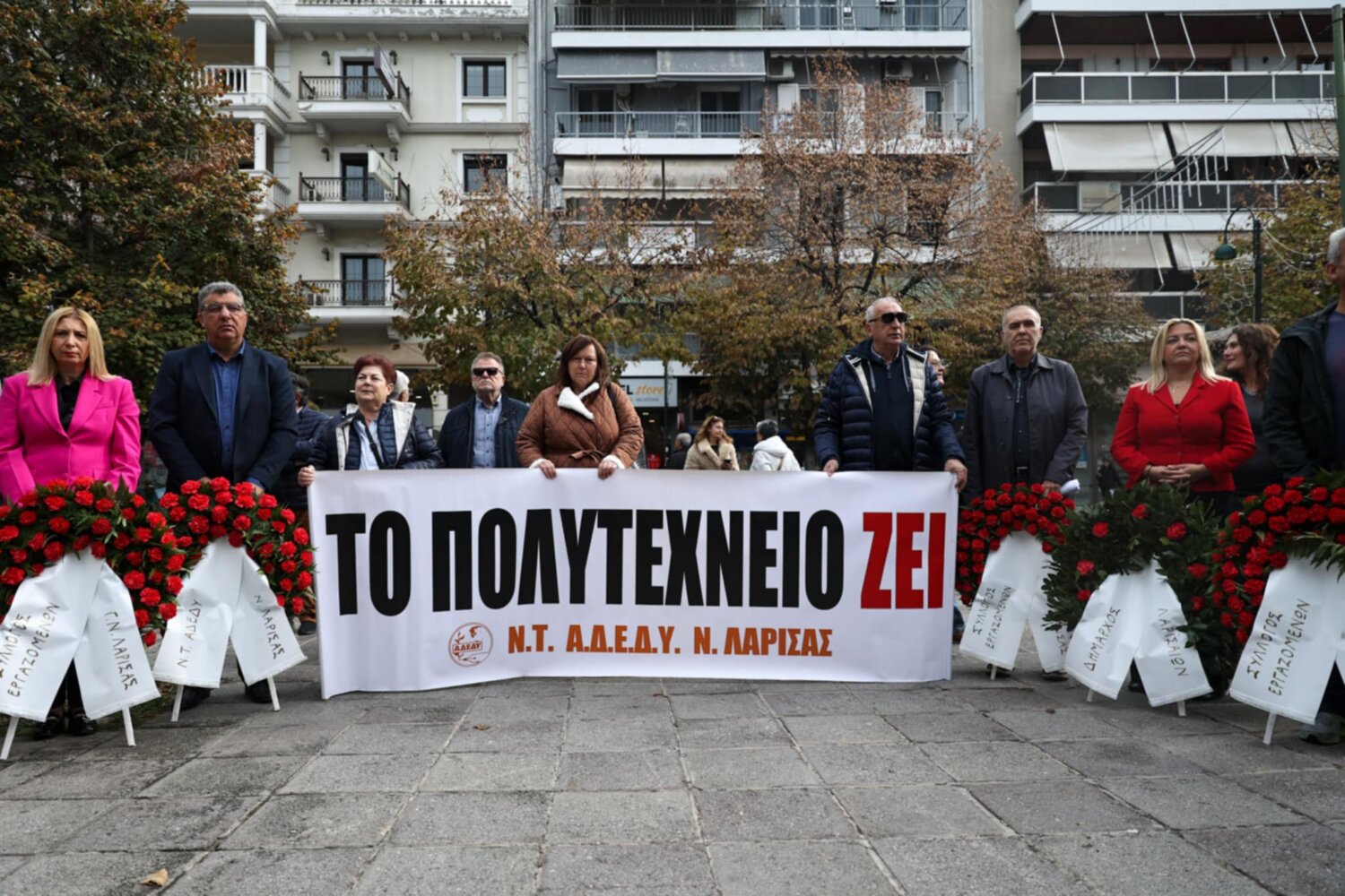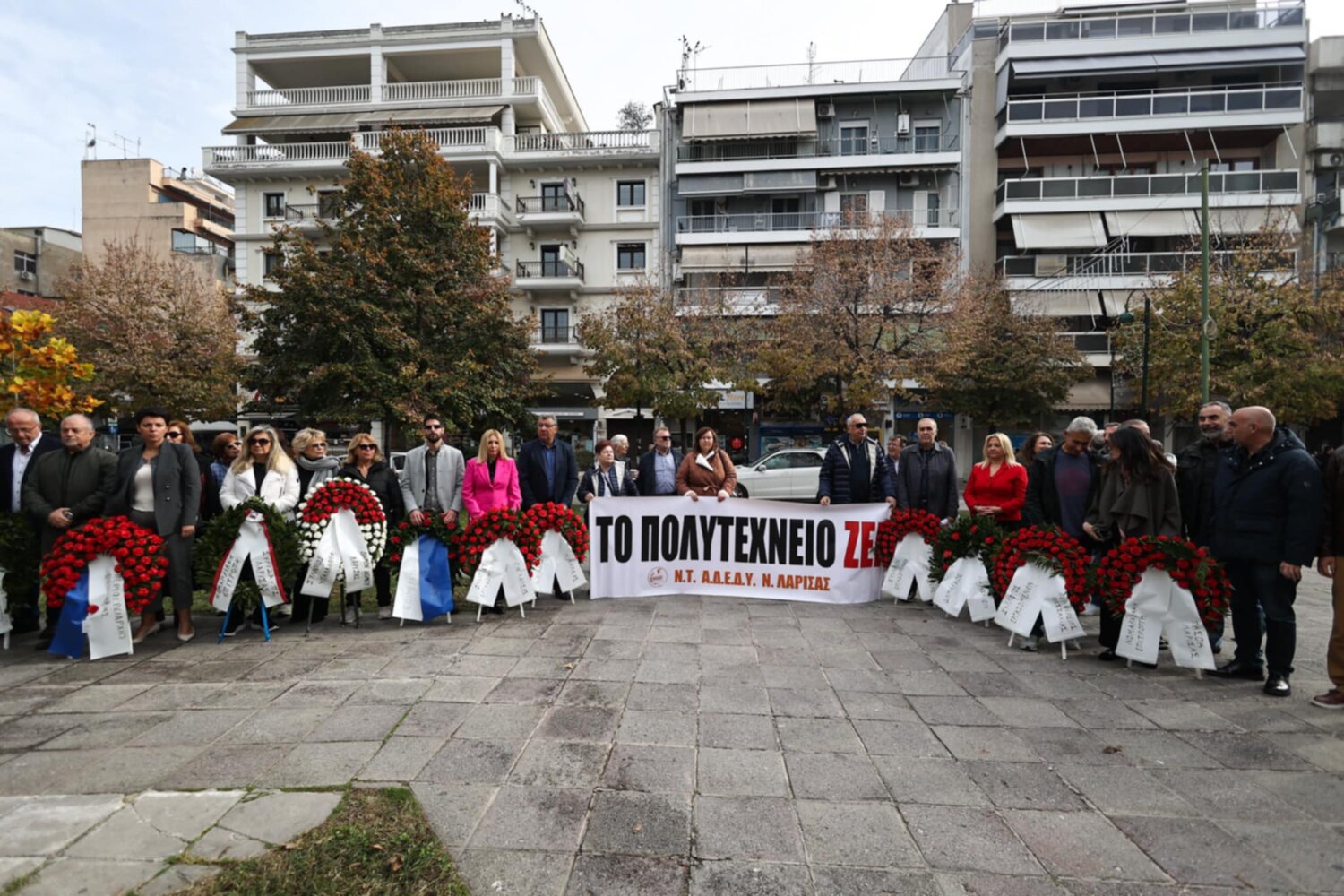 Λίγο μετά τις 11 το πρωί Πρωτοβάθμια Σωματεία-μέλη της, φορείς, συνταξιούχοι συμμετείχαν στην συγκέντρωση-κατάθεση στεφάνων στην πλατεία μπροστά από το κτίριο της Περιφέρειας στη Λάρισα.