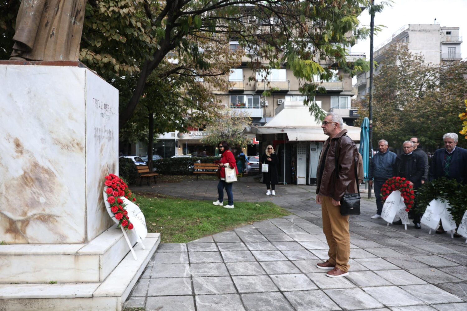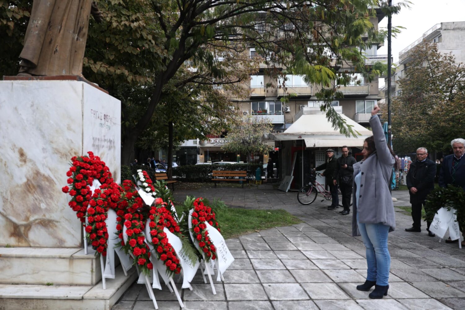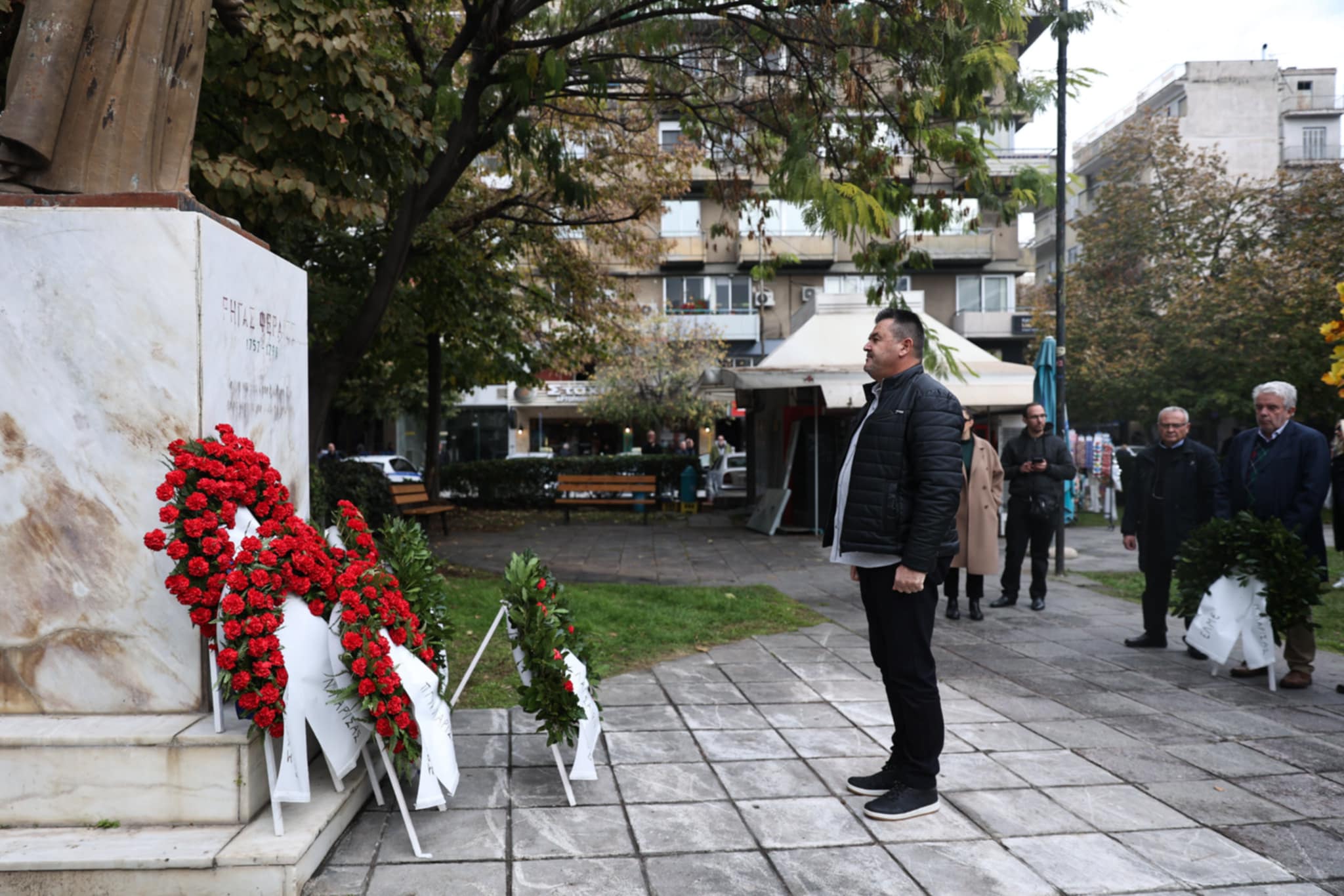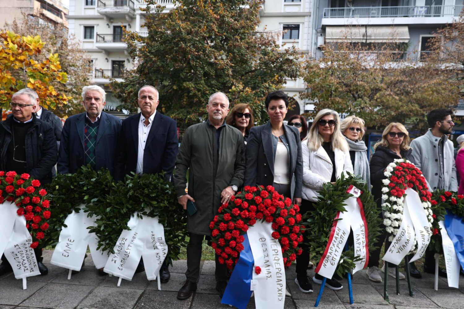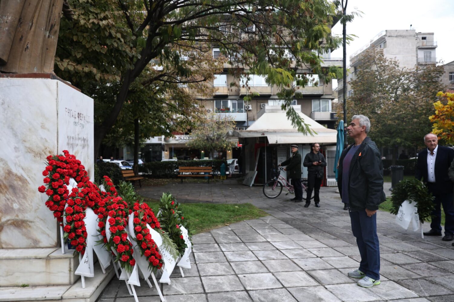 Λίγο μετά τις 11 το πρωί Πρωτοβάθμια Σωματεία-μέλη της, φορείς, συνταξιούχοι συμμετείχαν στην συγκέντρωση-κατάθεση στεφάνων στην πλατεία μπροστά από το κτίριο της Περιφέρειας στη Λάρισα.