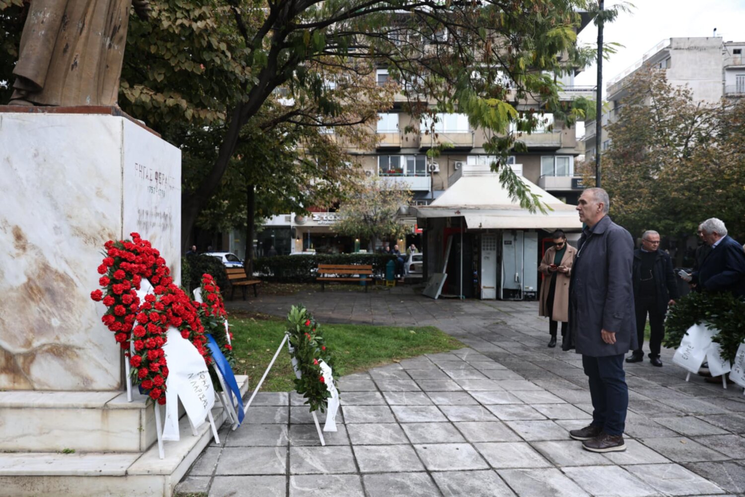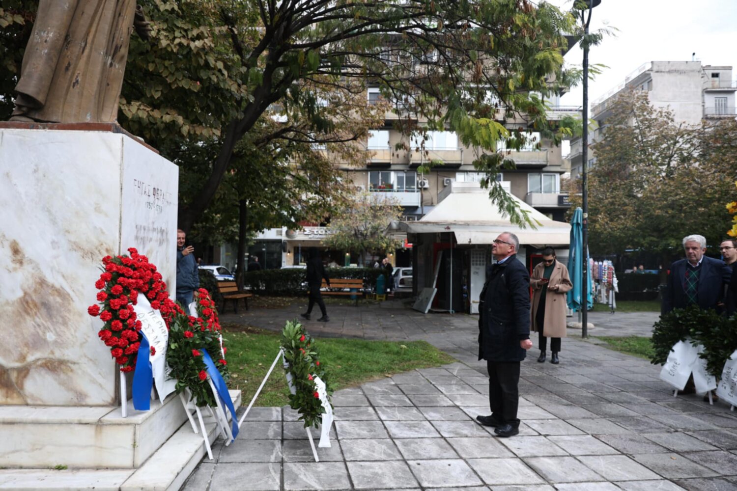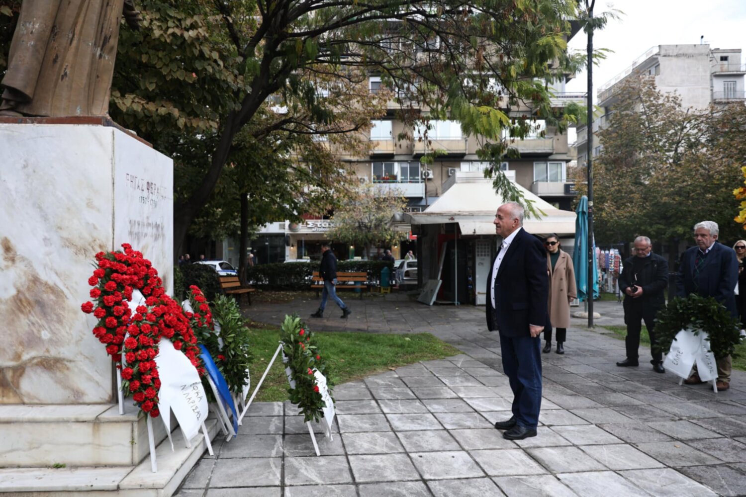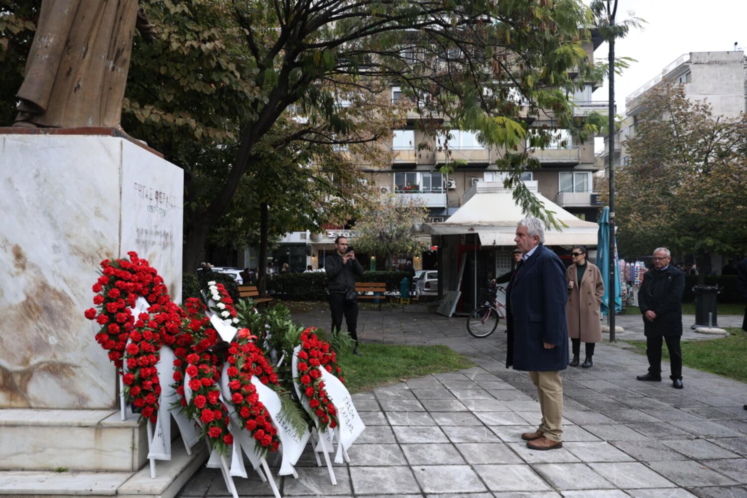 Λίγο μετά τις 11 το πρωί Πρωτοβάθμια Σωματεία-μέλη της, φορείς, συνταξιούχοι συμμετείχαν στην συγκέντρωση-κατάθεση στεφάνων στην πλατεία μπροστά από το κτίριο της Περιφέρειας στη Λάρισα.