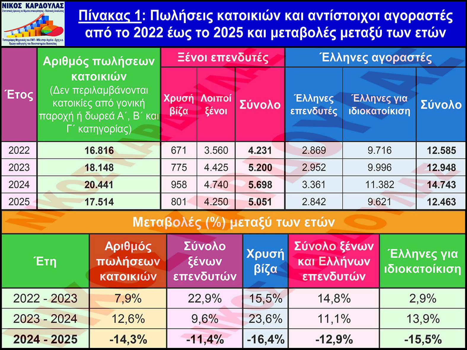 Στον πίνακα 1 που ακολουθεί απεικονίζονται οι αριθμοί πωλήσεων κατοικιών από το 2022 έως το 2025, στις οποίες δεν περιλαμβάνονται οι κατοικίες από γονική παροχή ή δωρεά Α΄, Β΄ και Γ΄ κατηγορίας, οι αντίστοιχοι αγοραστές, είτε ξένοι (χρυσή βίζα και λοιποί), είτε Έλληνες (επενδυτές και αγοραστές για ιδιοκατοίκηση) και οι αντίστοιχες μεταβολές μεταξύ των ετών. Για το 2025 τα διαθέσιμα στοιχεία ήταν μέχρι και τον Οκτώβριο και έγινε εκτίμηση για όλο το έτος, ώστε να γίνει σύγκριση με τα άλλα έτη.