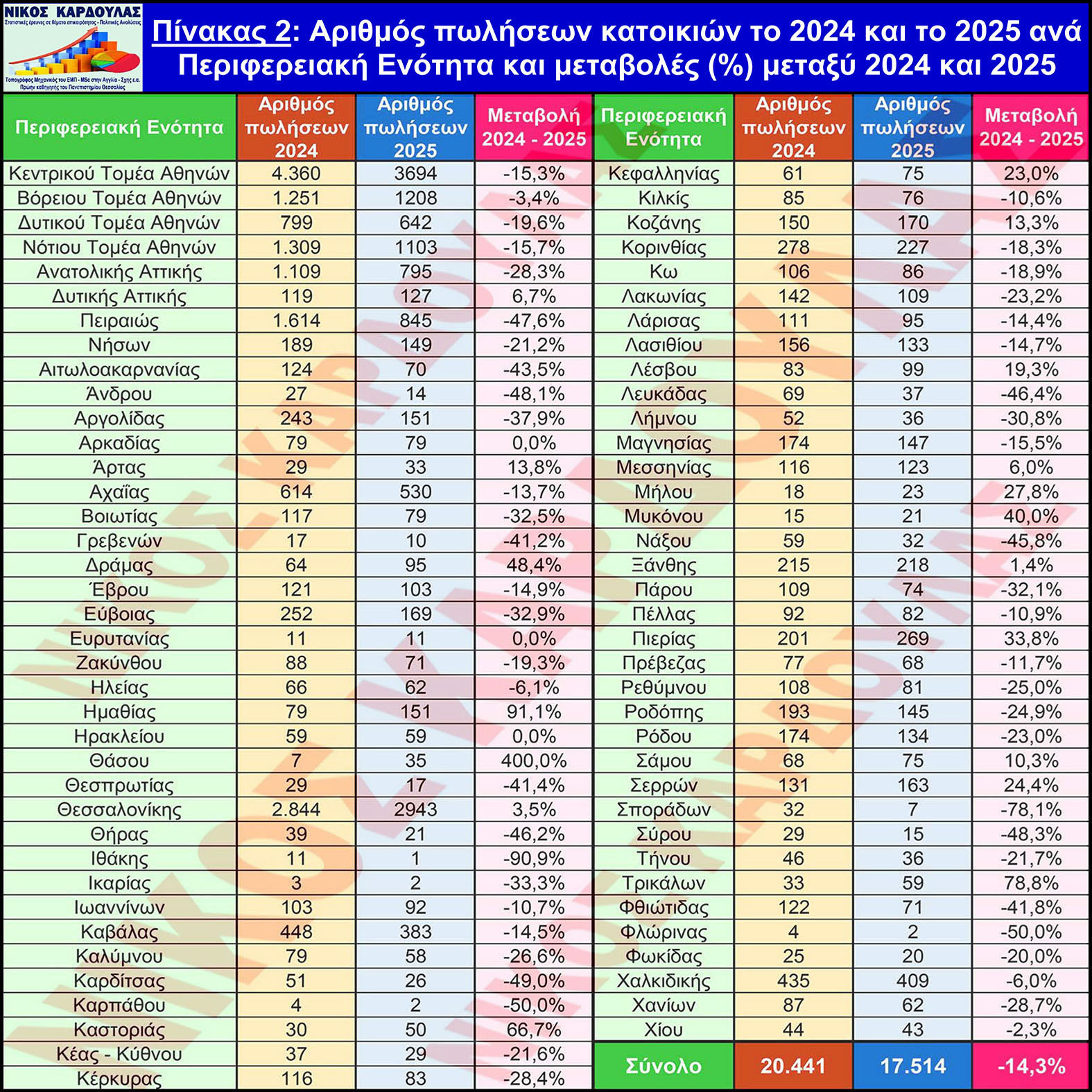 Στον πίνακα 2 που ακολουθεί απεικονίζονται οι αριθμοί πωλήσεων κατοικιών ανά ΠΕ για το 2024 και το 2025, στις οποίες δεν περιλαμβάνονται οι κατοικίες από γονική παροχή ή δωρεά Α΄, Β΄ και Γ΄ κατηγορίας και η σχετική μεταβολή (%) μεταξύ των δύο ετών για όλες τις ΠΕ της χώρας.