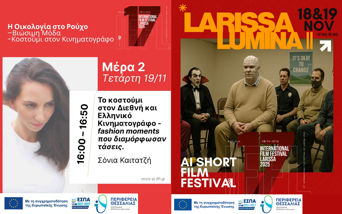 Στο πλαίσιο του 17ου Διεθνούς Φεστιβάλ Κινηματογράφου Λάρισας (IFFL), το οποίο διοργανώνεται από την ΑΜΚΕ Artfools, με συγχρηματοδότηση από το Πρόγραμμα ΘΕΣΣΑΛΙΑ (ΕΣΠΑ 2021 – 27), πραγματοποιείται στις 19 Νοεμβρίου στο Πάρκο Καινοτομίας JOIST στις 16:00 η εκδήλωση με θέμα: Το κοστούμι στον Διεθνή και Ελληνικό Κινηματογράφο – Fashion moments που διαμόρφωσαν τάσεις.