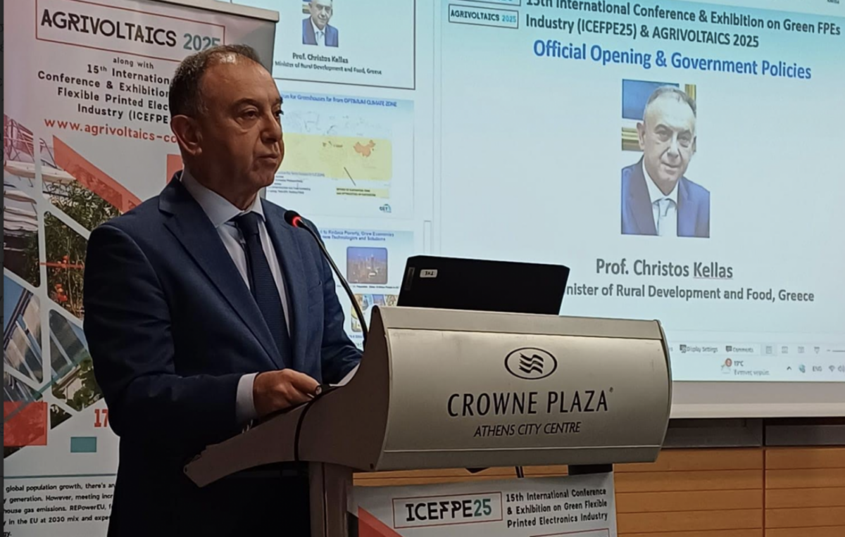Με ιδιαίτερη έμφαση στον κομβικό ρόλο της τεχνολογικής καινοτομίας στη σύγχρονη αγροτική παραγωγή, ο Υφυπουργός Αγροτικής Ανάπτυξης και Τροφίμων, κ. Χρήστος Κέλλας, απηύθυνε χαιρετισμό σήμερα στο Διεθνές Συνέδριο AGRIVOLTAICS 2025, το οποίο φιλοξενεί κορυφαίους επιστήμονες, ερευνητικά ιδρύματα, επιχειρήσεις υψηλής τεχνολογίας και θεσμικούς φορείς από την Ελλάδα και το εξωτερικό.