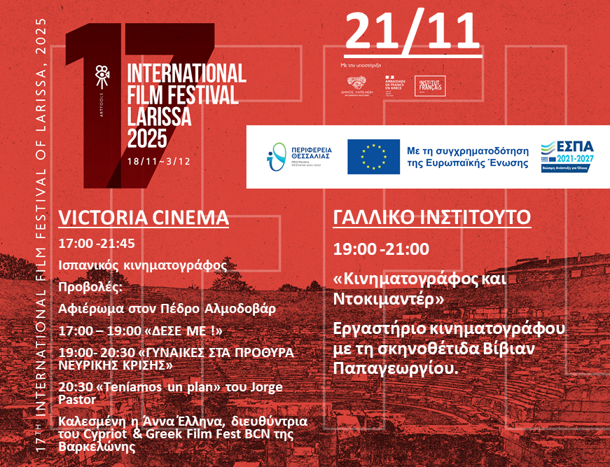 Το 17ο Διεθνές Φεστιβάλ Κινηματογράφου Λάρισας, το οποίο διοργανώνεται από την αστική μη κερδοσκοπική εταιρεία Artfools, με συγχρηματοδότηση από το Πρόγραμμα ΘΕΣΣΑΛΙΑ (ΕΣΠΑ 2021 – 27) με την υποστήριξη του Δήμου Λαρισαίων και του Γαλλικού Ινστιτούτου, συνεχίζεται την Παρασκευή, 21 Νοεμβρίου με αφιέρωμα στον Ισπανικό Κινηματογράφο και τον σκηνοθέτη Πέδρο Αλμοδοβάρ καθώς και ένα εργαστήριο αφιερωμένο στις βασικές κινηματογραφικές αρχές και την τέχνη του ντοκιμαντέρ. Αναλυτικότερα, είναι προγραμματισμένες οι εξής εκδηλώσεις: