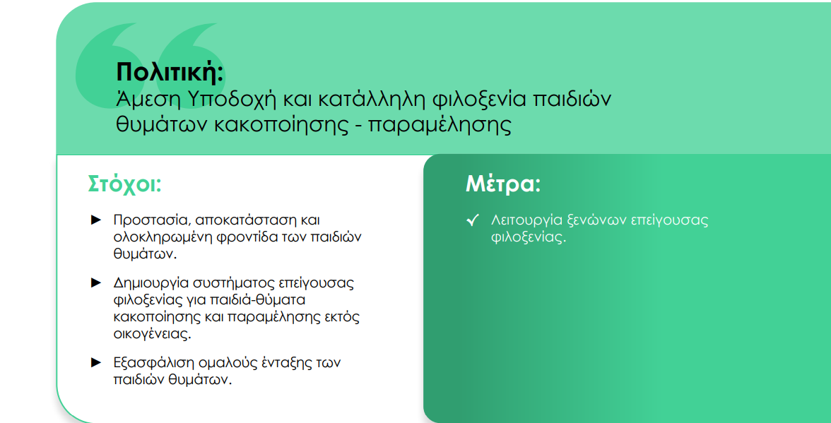 Αναλυτικά τονίζεται πως «για τις περιπτώσεις που ο Εισαγγελέας προβαίνει στην άμεση απομάκρυνση του/των παιδιού/παιδιών από την οικογένεια, χρειάζεται η δημιουργία ενός συστήματος υποδοχής και κατάλληλης φιλοξενίας του/τους. Επ’ αυτού, διαπιστώνεται έντονη η ανάγκη τοποθέτησής τους σε ασφαλείς και κατάλληλους χώρους διαμονής, καθώς σήμερα, σε συνέχεια της απομάκρυνσής τους με εισαγγελική εντολή, παραμένουν επί μακρόν στις Παιδιατρικές Κλινικές των Νοσοκομείων με ιδιαίτερα αρνητικές επιπτώσεις στην ψυχοκοινωνική τους ανάπτυξη».