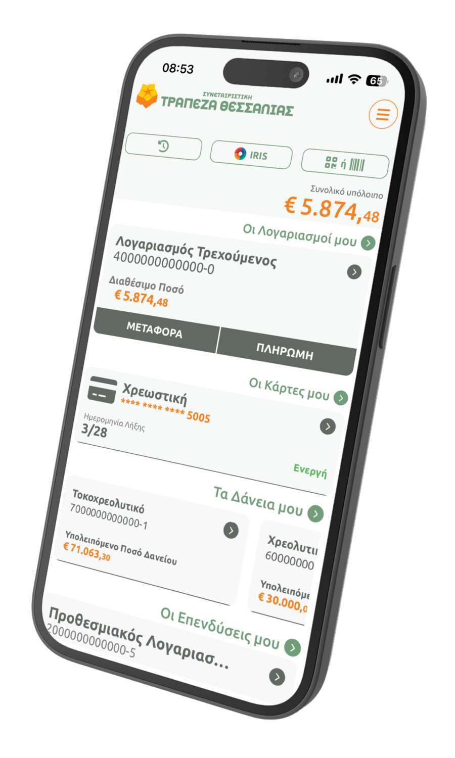 H εφαρμογή ThessalyBank παρέχει γρήγορη και ασφαλή πρόσβαση μέσω 4ψήφιου PIN ή βιομετρικών στοιχείων της συσκευής. Στην αρχική σελίδα οι πελάτες έχουν ολοκληρωμένη εικόνα των λογαριασμών, των δανείων, των καρτών και των προθεσμιακών καταθέσεών , ενώ μπορούν να πραγματοποιούν άμεσες συναλλαγές, όπως πληρωμές και μεταφορές κεφαλαίου, χρησιμοποιώντας παράλληλα QR Code ή Barcode για γρήγορη πληρωμή λογαριασμών. Όλες οι κινήσεις και οι σημαντικές πληροφορίες συγκεντρώνονται στην αρχική οθόνη, εξασφαλίζοντας ένα φιλικό και εύχρηστο περιβάλλον για τον χρήστη.