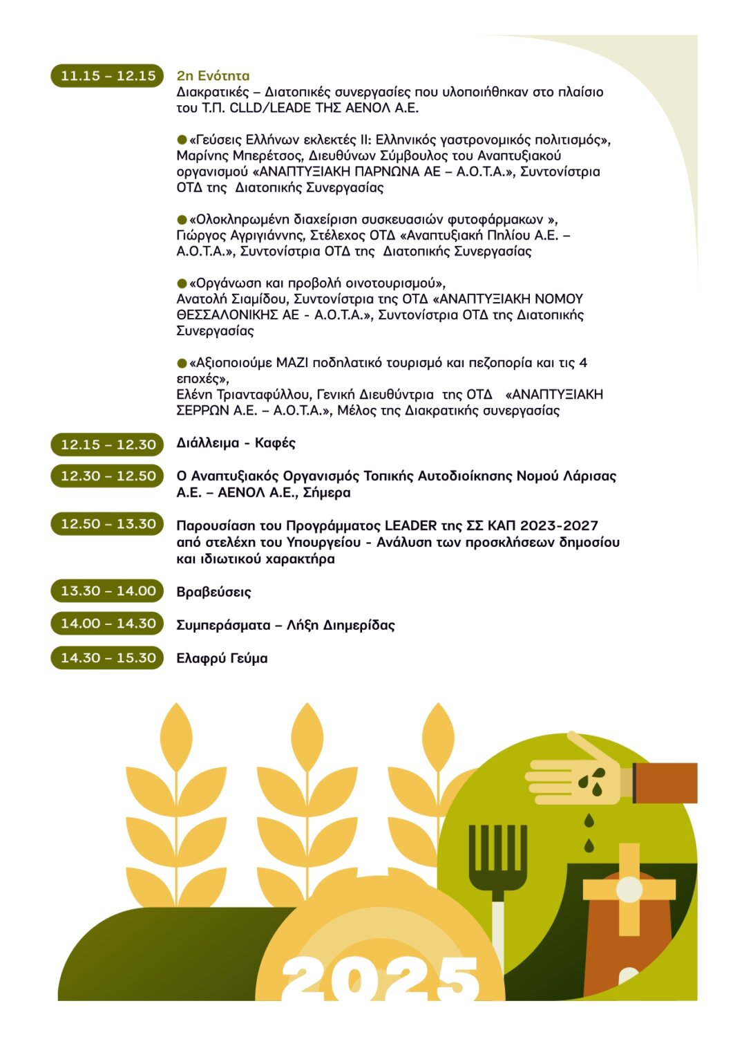 Η εκδήλωση θα περιλαμβάνει τοποθετήσεις εκπροσώπων της πολιτείας και της τοπικής αυτοδιοίκησης, καθώς και θεματικές ενότητες αφιερωμένες στη νέα προγραμματική περίοδο και στις προοπτικές του προγράμματος LEADER.