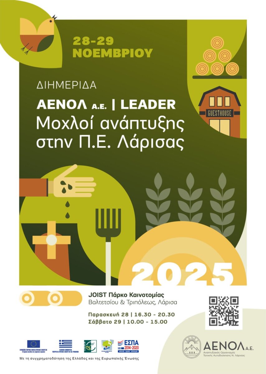 Ο Αναπτυξιακός Οργανισμός Τοπικής Αυτοδιοίκησης Νομού Λάρισας Α.Ε. – ΑΕΝΟΛ Α.Ε., με αφορμή την ολοκλήρωση του προγράμματος CLLD/LEADER του Προγράμματος «Αγροτική Ανάπτυξη της Ελλάδας 2014-2020» (ΠΑΑ), διοργανώνει επετειακή εκδήλωση με τίτλο «ΑΕΝΟΛ και LEADER: Μοχλοί Ανάπτυξης στην Π.Ε. Λάρισας», στο πλαίσιο εμψύχωσης του τοπικού πληθυσμού και των ενεργειών προβολής του τοπικού προγράμματος CLLD/LEADER και την παρουσίαση των αποτελεσμάτων του.