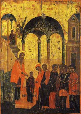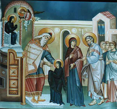 “Ο καθαρώτατος ναὸς του Σωτήρος, η πολυτίμητος παστὰς και Παρθένος, το ιερὸν θησαύρισμα της δόξης του Θεού, σήμερον εισάγεται, εν τω οίκω Κυρίου, την χάριν συνεισάγουσα, την εν Πνεύματι θείω· ην ανυμνούσιν Άγγελοι Θεού. Αύτη υπάρχει σκηνὴ επουράνιος.” (Κοντάκιο)