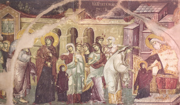 “Έτσι (…) απετέθη δικαίως σήμερα στα άγια άδυτα, σαν θησαυρὸς του Θεού, η κόρη που εξελέγη ανάμεσα στους εκλεκτοὺς απὸ αιώνες, που ἀναδείχθηκε αγία των αγίων, που έχει το σώμα καθαρώτερο και θειότερο ακόμη και απὸ τα διὰ της αρετής κεκαθαρμένα πνεύματα, ώστε να μην είναι δεκτικὸ μόνο του τύπου των θείων λόγων, αλλὰ και του ιδίου του ενυποστάτου και μονογενούς Λόγου του προανάρχου Πατρός· σαν θησαυρὸς που ο Λόγος θα τον χρησιμοποιούσε στον καιρὸ του, όπως και έγινε, γιὰ πλουτισμὸ και υπερκόσμιο και συγχρόνως παγκόσμιο κόσμημα.1” Ήταν λοιπόν ένα προκλητικό γεγονός, κάποιος άνθρωπος, και μάλιστα ένα κορίτσι, να εισέλθη στον ιερό χώρο, όπου φυλάσσονταν τα πιο ιερά αντικείμενα τού Ισραήλ, όπως η Κιβωτός της Διαθήκης, η Στάμνα με το Μάννα, η Ράβδος η βλαστήσασα του Ααρών και, βεβαίως, όπου ούτε οι ιερείς είχαν δικαίωμα να εισέλθουν, αλλά ούτε και ο Αρχιερεύς καθημερινά. Μέσα στα Άγια των Αγίων η Θεοτόκος για δώδεκα χρόνια τρεφόταν από άρτο που της έφερνε ο Αρχάγγελος Γαβριήλ. Αυτό ήταν ένα από τα πιο θαυμαστά γεγονότα του βίου της Θεοτόκου.