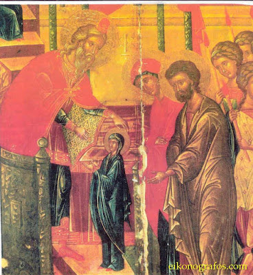 Εκεί στο ναό, λοιπόν, η Παρθένος διέμεινε δεκα χρόνια, ώσπου πλησίασε ο καιρός του θείου Ευαγγελισμού και των ουρανίων και υπερφυσικών μηνυμάτων, που προμηνούσαν ότι ο Θεός ευδόκησε να σαρκωθεί απ’ αυτήν σαν φιλάνθρωπος, για να αναπλάσει τον φθαρέντα από την αμαρτία κόσμο. Η Θεοτόκος εξήλθε τότε από τα άγια των αγίων του ναού και δόθηκε στον μνήστορα Ιωσήφ, για να είναι αυτός προστάτης της και μάρτυς της παρθενίας της και για να υπηρετήσει τον άσπορο τόκο της, στη φυγή στην Αίγυπτο και στην επάνοδό της απ’ εκεί στη γη Ισραήλ.