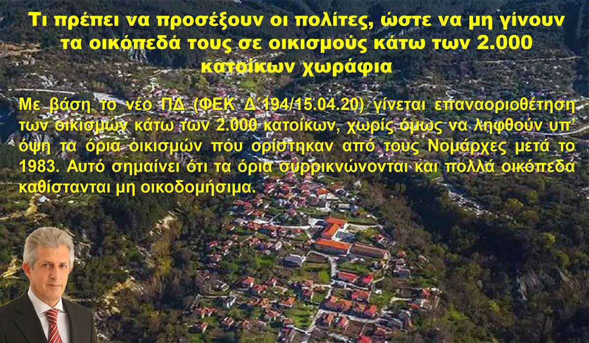 Με βάση το νέο ΠΔ (ΦΕΚ Δ΄194/15.04.20) γίνεται επαναοριοθέτηση των οικισμών κάτω των 2.000 κατοίκων, χωρίς όμως να ληφθούν υπ’ όψη τα όρια οικισμών που ορίστηκαν από τους Νομάρχες μετά το 1983. Αυτό σημαίνει ότι τα όρια συρρικνώνονται και πολλά οικόπεδα καθίστανται μη οικοδομήσιμα.
