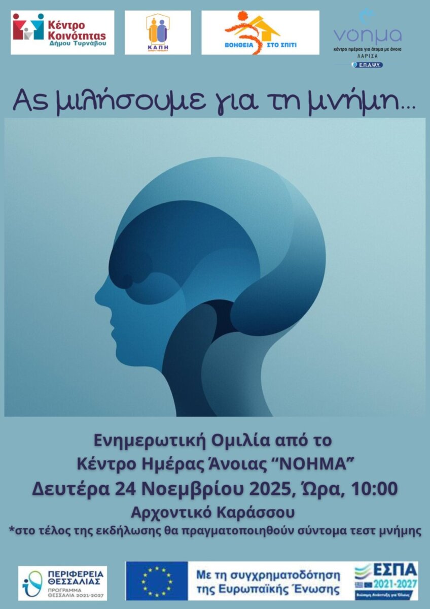Το Κέντρο Κοινότητας, το Βοήθεια στο Σπίτι και το ΚΑΠΗ του Δήμου Τυρνάβου σε συνεργασία με το Κέντρο Ημέρας Άνοιας Λάρισας «Νόημα», εστιάζοντας στις ανάγκες της τρίτης ηλικίας, διοργανώνουν ενημερωτική εκδήλωση στον Τύρναβο με στόχο την ενημέρωση, καθοδήγηση και υποστήριξη των ενδιαφερομένων σε ζητήματα που τους απασχολούν.