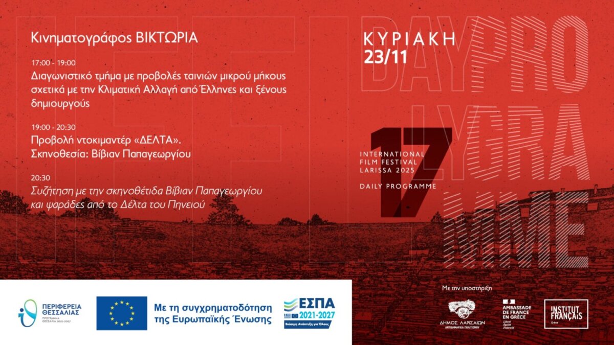 Για αύριο Κυριακή, 23 Νοεμβρίου προβλέπονται προβολές ταινιών που εστιάζουν στην κλιματική αλλαγή και στα σύγχρονα περιβαλλοντικά προβλήματα. Αναλυτικότερα, το πρόγραμμα της ημέρας: