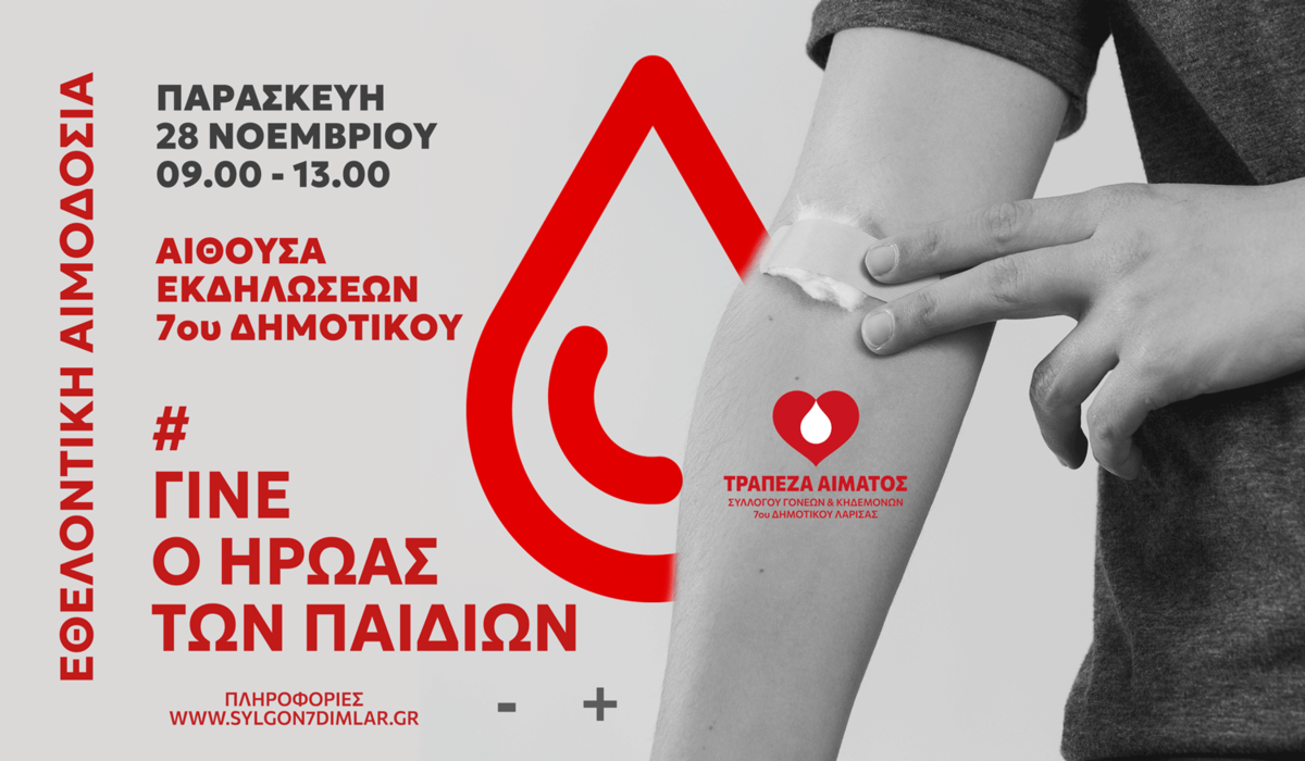 Ο Σύλλογος Γονέων & Κηδεμόνων του 7ου Δημοτικού Σχολείου Λάρισας ανακοινώνει τη διοργάνωση της 2ης Εθελοντικής Αιμοδοσίας του Συλλόγου, η οποία θα πραγματοποιηθεί την Παρασκευή 28 Νοεμβρίου 2025, στην αίθουσα εκδηλώσεων του σχολείου (Κουμουνδούρου 53 – Είσοδος από Αριστοτέλους), από τις 09:00 έως τις 13:00.
