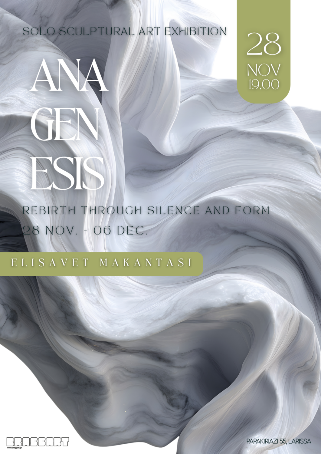 Η γκαλερί σύγχρονης τέχνης Braggart Contemporary Gallery παρουσιάζει την ατομική έκθεση της εικαστικού Ελισάβετ Μακαντάση, με τίτλο «ANAGENESIS» από τις 28 Νοεμβρίου έως 06 Δεκεμβρίου 2025, στο art box Παπακυριαζή 55 & Σκαρλάτου Σούτσου στη Λάρισα. Τα εγκαίνια της έκθεσης θα γίνου Παρασκευή 28 Νοεμβρίου στις 19:00. Παράλληλα θα σας παρουσιάσουμε το γούρι της Braggart για το 2026 που δημιούργησε η Ελισάβετ Μακαντάση.
