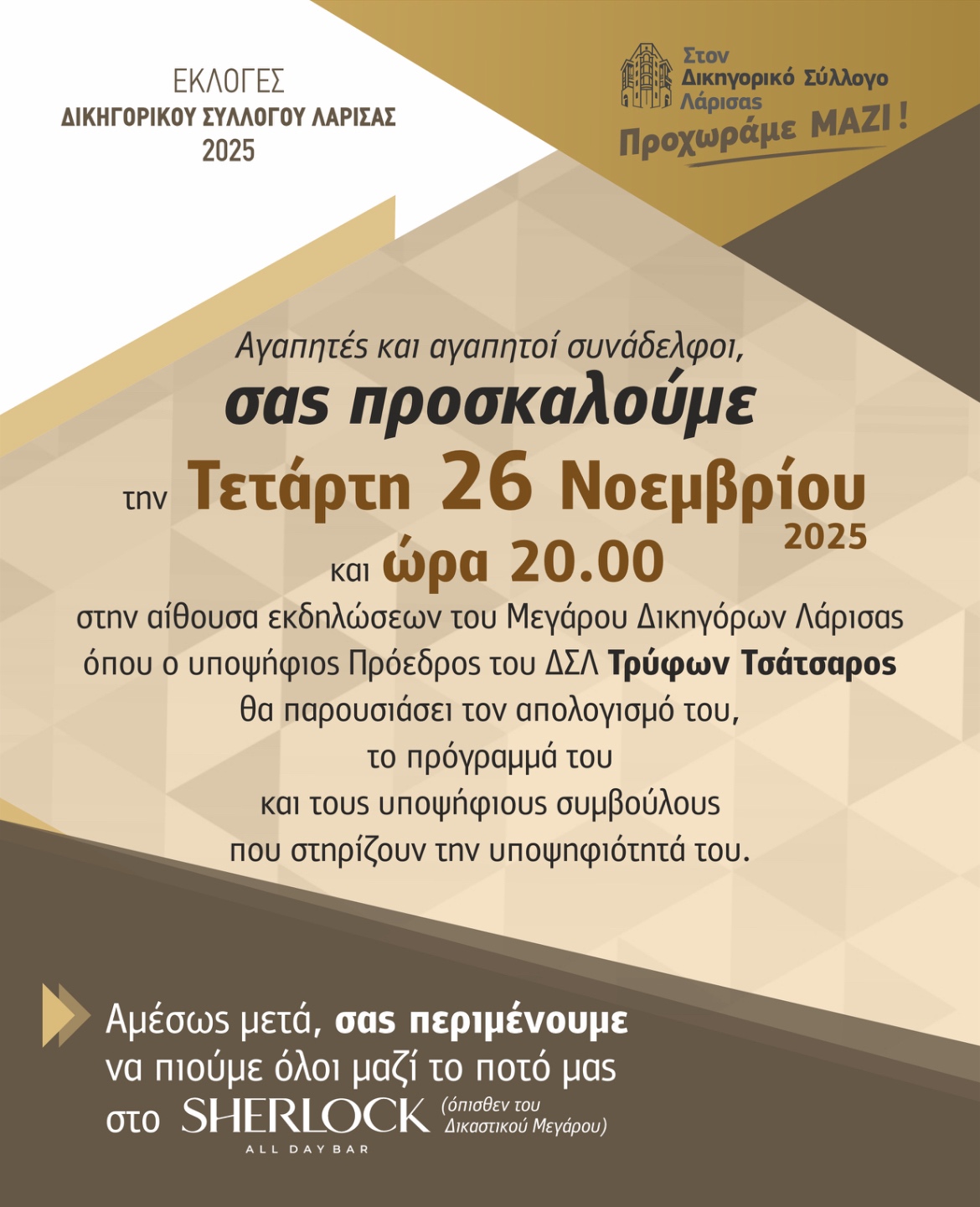 Αύριο Τετάρτη στην αίθουσα εκδηλώσεων του Μεγάρου Δικηγόρων Λάρισας, ο κ. Τρύφωνας Τσάτσαρος, υποψήφιος πρόεδρος του ΔΣΛ θα παρουσιάσει τον απολογισμό του, το πρόγραμμά του αλλά και τους υποψηφίους που στηρίζουν την υποψηφιότητά του.