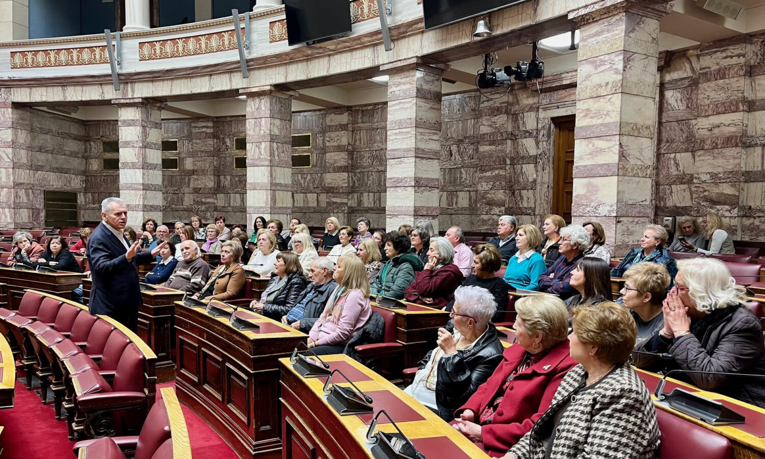 Ο Μάξιμος Χαρακόπουλος, καθώς, όπως είπε, «συνήθως στη Βουλή υποδεχόμαστε μαθητές σχολείων και όχι συνταξιούχους, επιτρέψτε μου να φωτίσω μια διάσταση του δημογραφικού που συχνά παραβλέπουμε. Προφανώς το δημογραφικό πρόβλημα είναι μείζον όχι μόνο στην Ελλάδα αλλά σε όλη την άλλοτε αποκαλούμενη “χριστιανική δύση”. Ένα πρόβλημα το οποίο δεν είναι ζήτημα μόνο επιδομάτων και μέτρων στήριξης, αλλά και νοοτροπίας και προτύπων ζωής. Πολλά μπορούμε να κάνουμε προς αυτή την κατεύθυνση, έστω και τώρα είναι θετικό ότι λαμβάνονται στοχευμένα μέτρα. Μια άλλη, όμως, διάσταση του δημογραφικού είναι η υγιής γήρανση του πληθυσμού. Καθώς το προσδόκιμο ζωής αυξάνεται είναι σημαντικό να φροντίζουμε για την υγιή γήρανση του πληθυσμού, ώστε να χαίρονται τη ζωή οι ηλικιωμένοι, να είναι χρήσιμοι όχι μόνο στα παιδιά και τα εγγόνια τους, αλλά και στην κοινωνία συμμετέχοντας σε δράσεις εθελοντισμού. Γι’ αυτό και είναι αναμφίβολα θετικές οι δωρεάν προληπτικές εξετάσεις που καθιερώθηκαν από την παρούσα κυβέρνηση από τον καρκίνο του παχέος εντέρου μέχρι τον καρδιολογικό έλεγχο πριν βγει κανείς στη σύνταξη. Έτσι και το δημόσιο σύστημα υγείας επιβαρύνεται λιγότερο και οι συνταξιούχοι μπορούν να έχουν υγιή γήρανση ως ενεργοί πολίτες μέχρι τα βαθιά τους γεράματα. Αυτό και σας εύχομαι, να είστε υγιείς και δραστήριοι».