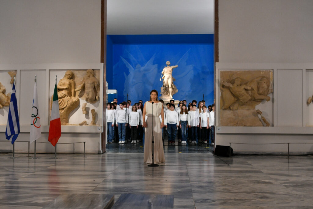 Τον Ολυμπιακό Ύμνο ερμήνευσε η σοπράνο κολορατούρα Χριστίνα Πουλίτση και τους Εθνικούς Ύμνους Ελλάδας και Ιταλίας η παιδική χορωδία της Ιταλικής Σχολής Αθηνών. Το ποίημα «Το φως της Ολυμπίας» του Τάκη Δόξα απήγγειλε ο σπουδαίος ηθοποιός Γιάννη Στάνκογλου, ενώ την τελετή παρουσίασε η καταξιωμένη δημοσιογράφος Δώρα Αναγνωστοπούλου.