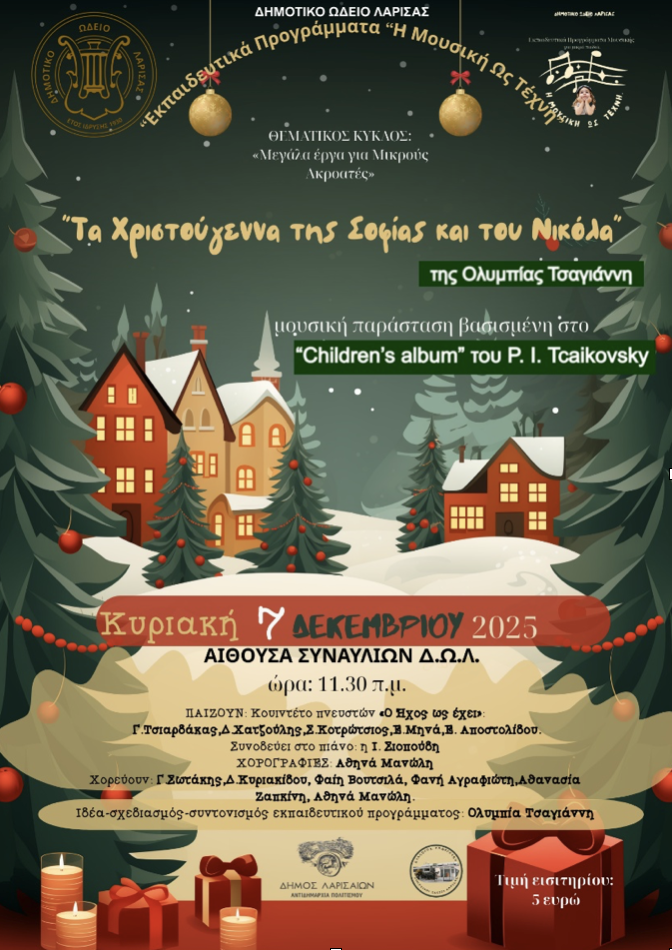 Τη μουσική παράσταση «Τα Χριστούγεννα της Σοφίας και του Νικόλα», μια γιορτινή ιστορία βασισμένη στις μουσικές του Children’s Album του Πιοτρ Ίλιτς Τσαϊκόφσκι, παρουσιάζει το Δημοτικό Ωδείο Λάρισας, την Κυριακή 7 Δεκεμβρίου 2025, ώρα 11:30 π.μ., στην Αίθουσα Συναυλιών του Δημοτικού Ωδείου Λάρισας.