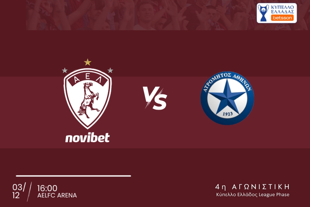 Η ΠΑΕ ΑΕΛ Novibet ενημερώνει τους φιλάθλους της ότι ξεκίνησε η διάθεση των εισιτηρίων του αγώνα της 4ης Αγωνιστικής της League Phase του Κυπέλλου Ελλάδας Betsson με αντίπαλο τον Ατρόμητο στο AEL FC ARENA (03/12, 16:00).